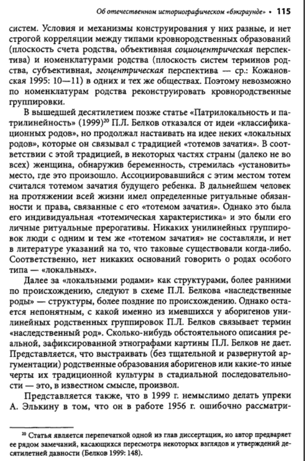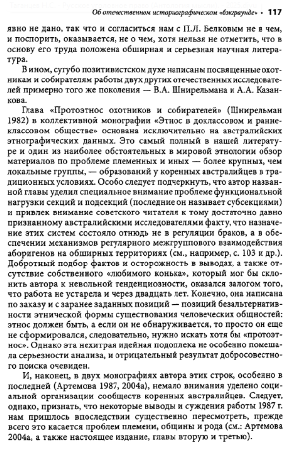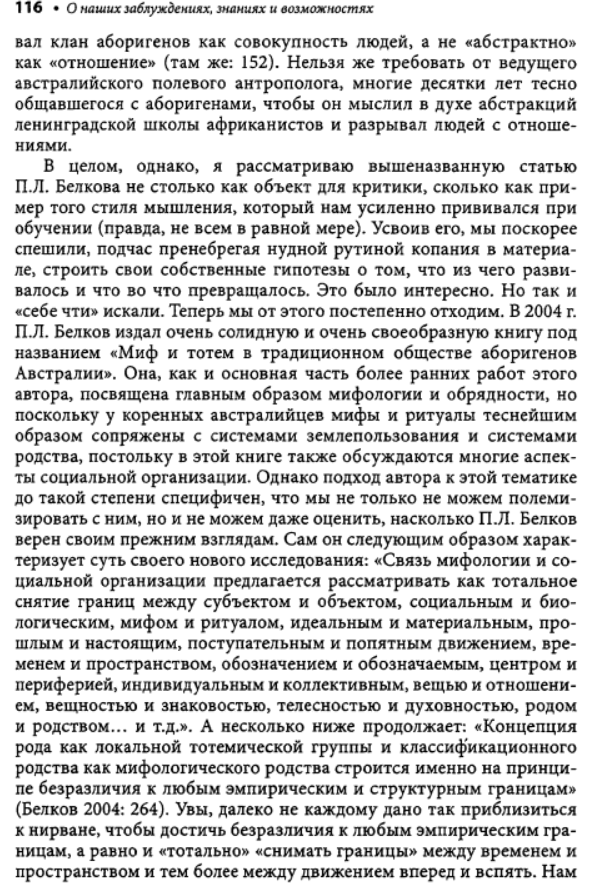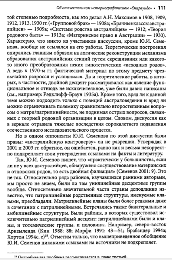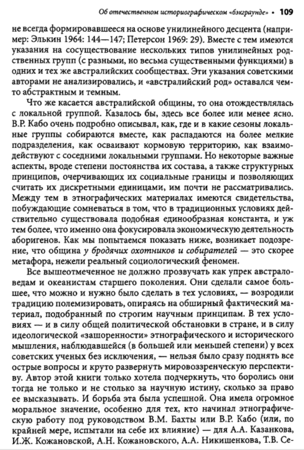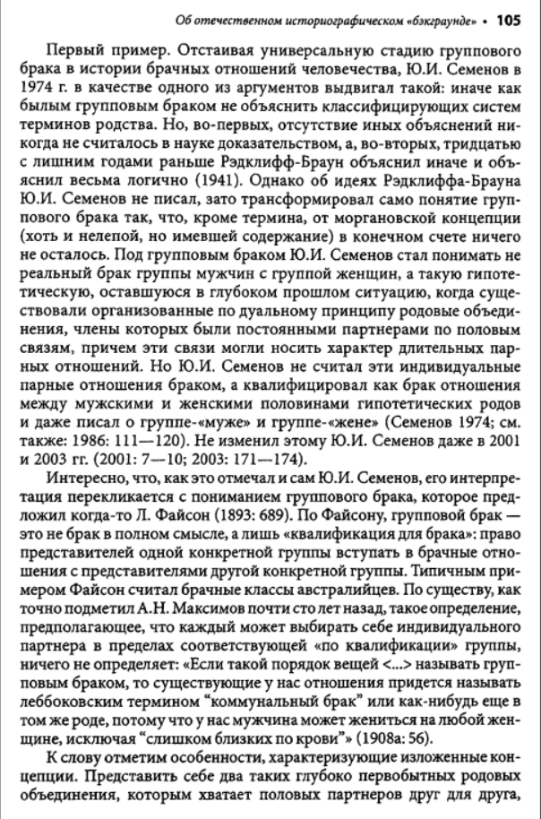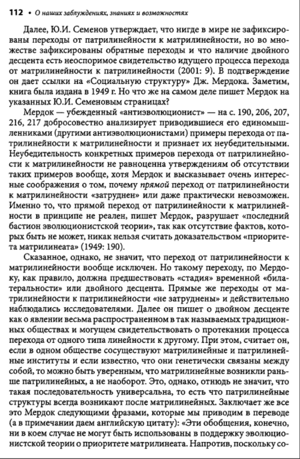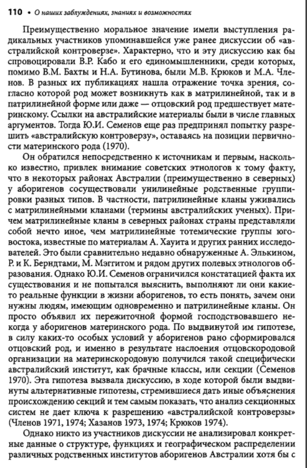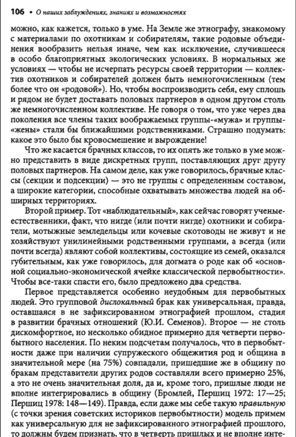 Взять хотя бы написанную Семеновым большую главу во втором томе изданной Институтом этнографии "Истории первобытного общества". Перед глазами изумленного читателя развертывается красочная, полная невероятных подробностей панорама жизни в первобытном стаде. Семенов рисует исполненную драматизма жизнь в условиях царившего тогда, по его мнению, промискуитета - состояния беспорядочных половых связей, ярко изображает бурные оргии коллективных жен и мужей; вот как только сумел он узнать все это? Заимствуя у эволюционистов прошлого века метод пережитков, он для доказательства своих построений привлекает обычаи современных народов и переносит их, не утруждая себя научной аргументацией, в эпоху, когда по земле бродили еще предки современных людей - неандертальцы. На наших глазах он творит новую мифологию. Мифологема первобытного человеческого стада - матриархата-патриархата, прочно укоренившаяся в советской науке, обогащается новыми подробностями, но в сущности остается все той же. Первоначальный род, возникший непосредственно из промискуитета, был, конечно, материнским. Родовая организация, конечно, универсальна и отождествляется Семеновым, как и его единомышленниками, с первобытной общиной. Человечество движется вперед стройными рядами, отклонения от генеральной линии, как и много лет назад, все еще не допускаются. Нежелательные факты, противоречащие этой стройной концепции, попросту объявляются несуществующими. А ведь все это опубликовано уже в 1986 году. Схема авторов "Истории первобытного общества" - а издание это должно было стать, по их замыслу, последним словом советской науки - почти ничем не отличается от схемы, которая была в ходу лет пятьдесят тому назад. Да что там: в сфере общих концептуальных построений советская история первобытного общества все еще вращается в кругу понятий столетней давности.