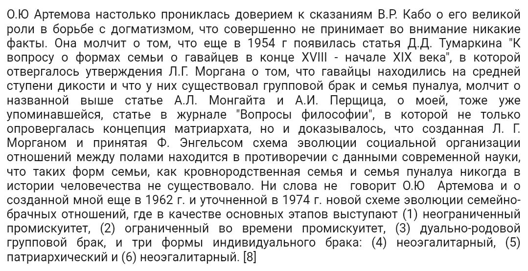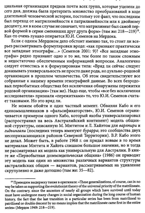С появлением Семенова догматизм, свойственный советской истории первобытности, не отталкивал больше своей провинциальной заскорузлостью, он был поднят на новую, еще невиданную ступень - он стал полнокровным мифом. Семенова посылали с самыми ответственными докладами на международные конгрессы и конференции, он высоко ценился как участник дискуссий, как авторитетный знаток непогрешимого учения, как автор, которому можно было поручить важнейшие теоретические статьи и разделы коллективных трудов. В полемике, однако, он не отличался честностью. Он умел, и это было излюбленным его приемом, исказить до неузнаваемости мысли противника, приписать ему то, чего он в действительности никогда не говорил и не писал, чтобы затем с легкостью все это опровергнуть. И, конечно, среди полемических приемов Семенова и его друзей были давно зарекомендовавшие себя в советской науке обвинения противников в антимарксизме и ревизионизме, в протаскивании взглядов реакционных буржуазных ученых.