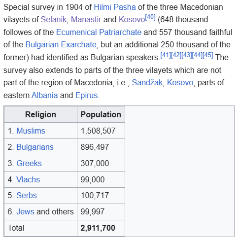>The 1911 edition of the Encyclopædia Britannica gave the following statistical estimates about the population of Macedonia:[14] >Slavs (described in the encyclopaedia as a "Slavonic population, the bulk of which is regarded by almost all independent sources as Bulgarians"): approximately 1,150,000, whereof, 1,000,000 Orthodox and 150,000 Muslims (called Pomaks) Turks: ca. 500,000 (Muslims) Greeks: ca. 250,000, whereof ca. 240,000 Orthodox and 14,000 Muslims Albanians: ca. 120,000, whereof 10,000 Orthodox and 110,000 Muslims Vlachs: ca. 90,000 Orthodox and 3,000 Muslims Jews: ca. 75,000 Roma: ca. 50,000, whereof 35,000 Orthodox and 15,000 Muslims In total 1,300,000 Christians (almost exclusively Orthodox), 800,000 Muslims, 75,000 Jews, a total population of ca. 2,200,000 for the whole of Macedonia. It needs to be taken into account that part of the Slavic-speaking population in southern Macedonia regarded itself as ethnically Greek and a smaller percentage, mostly in northern Macedonia, as Serbian. All Muslims (except the Albanians) tended to view themselves and were viewed as Turks, irrespective of their mother tongue То есть османский пиздеж судя по независимым источникам занижает христианское население более чем на 300к. Лол.