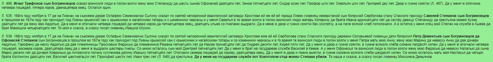 Перечень имущества Турабея — владельца двора на Подоле Московского Кремля и земель под Суздалем. 1400‒1410 ‛Вот кони Турабьевы: Из ездовых – жеребец, два коня саврасых, два лошачка – сивый и каурый. Лошачок гнедой, да - - - - - - - - лошачок каурый, да другой сивый оставлены Турабьевой жене. А рабочих лошадей две и три жеребенка годовалых, да рабочих кобыл 6, да кобылка годовалая. А всех ездовых девять, а рабочих двенадцать. Две коровы во дворе, два вола; и шесть коров, от которых работники пьют молоко. Три борова в садке (для откорма) и уток ({букв.:} утиного поголовья) 15. А на погребе котел пивной железный, да горшок тоже железный, да ведерко медное, да котел медный ведра в два, да ларець жестяной. А стогов 12 и (еще) стог. Велено же Турабьевой челяди есть со слугами. А молодых людей у Турабья: Оникейко, Молчан, Игнатко, Мосей, Байрам, Ахмед, Онташ, Жалорь, Еська. А работников 15: Созонко, Мосей Лухов, Ортемик, Ивака, Чермен, Родивонко, Иванец, Яковко, да четверо слуг, да ключник. А у тех его людей четырнадцать коней, принадлежащих Турабьевым «присохам»; а коровъ 9. А «в деле» за слугами денег: у Григорьеца полтина, у Остафьеца полтина, у Белка полтина, у Семенца полтина, у Сидорa полтина, у Мосейца полтина, у Осейца полтина, у Курьяна полтина. А всего денег Турабья за людьми «в деле» 4 рубля. А конюх сообщает о суздальских лошадях так: Кобыла бурая, да вороная, да пегая, да рыжая — те четыре рабочие; у них три жеребенка. А жеребчики годовалые – вороной, да рыжий, да чалый, да сивый, да гнедой белоногий. Да кобылки годовалые – саврасая белоногая, гнедая тоже белоногая, да гнедая, да голубая, да мухортая кобылка. А рабочие – каряя с жеребенком, да вороных кобыл две, да сивая, да тоже вороная кобыла. Да жеребчик гнедой белоногий, да старая кобыла бурая, да жеребчик четырехлетний вороной. И всех лошачков и кобыл и жеребят я отдал Кощею, человеку посельского, двадцать шесть. А это я дал перед Елбугою, перед Ильинским игуменом Федором, перед Климом и перед Петром Гурьевым’. {Приписка:} ‛А я взял двух лошачков сивых, да рыжего, да гнедого, да вороного, да жеребчика годовалого рыжего, звездка во лбу, - - - - - - - - - - - - - - - - . А конюхов я спрашивал перед Олексеем и перед Ондреем. Какие из стада лошадей Ондреевы лошади не погибли, всю ту сотню забрали господа. Не начнет ли он (Ондрей) [бить челом?] перед Елбугою и перед - - - - - - - - - -. А что я отдал - - - - - - - - - - - - - - - - - |[за мною?] было 62 лошади; а за меня дашь 32. Мне в убыток перешло 9 лошадей на тебя; перешло и на других. Падёж – за счет господ’.