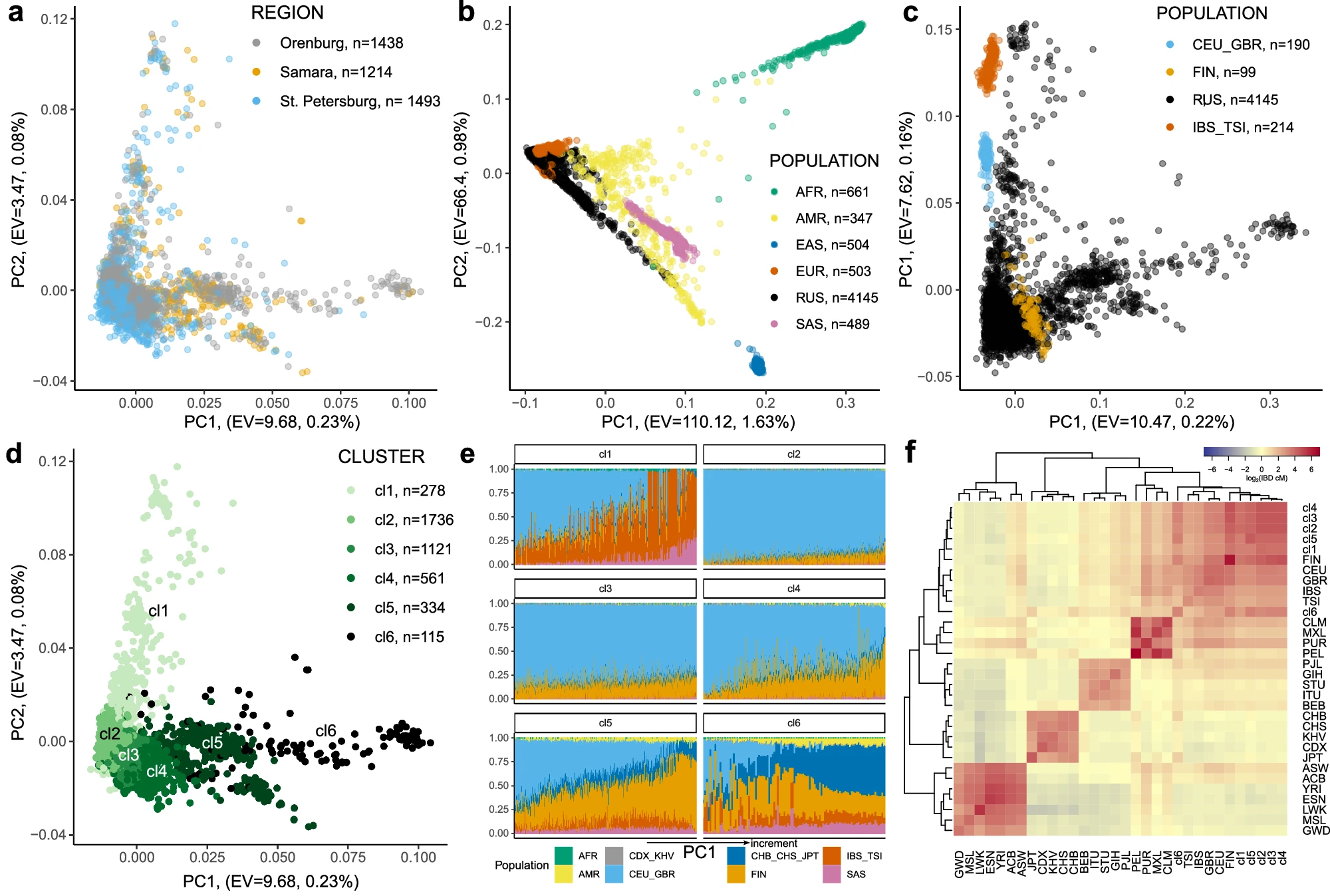 >three metro areas that participated in the ESSE-RF study: St. Petersburg, Samara, and Orenburg >the western Russian population is represented by individuals of admixed ancestry, spanning from European to East Asian continental ancestry >PCA with only European subpopulations from 1000 Genomes demonstrated closer relatedness of Russians to Finnish population >According to the clustering analysis, the Finns are closer to the first five Russian clusters than to the European populations from 1000 Genomes >Conclusively, the Russian population sampled in the large metro-areas represents a heterogeneous combination of individuals of admixed ancestries between European and Asian populations. >The analysis of population structure revealed an intricate pattern of relatedness among Russians, Finns, and East Asians. The Finnish population is historically unique; however, the genetic similarity of the Russian population illustrated above suggests that DNA variants enriched in Finns might also be found in Russia. >Our cohort illustrates that the genetic structure of the Russian population, sampled in metropolitan areas in the European part of the country, consists of the number of subpopulations with high relatedness to Finnish and East Asian populations.