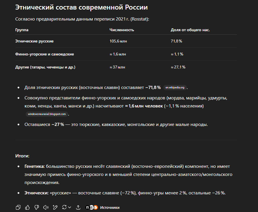 >>991695 >в РФ генетических финно-угров минимум в 2 раза больше, а учитывая последние данные - во все 15 раз На русском севере (архангельск, вологда, кострома, карелия) - суммарно живёт 3 миллиона человек, и далеко не все из них финны. 70% населения РФ живёт в европейской части, около 101 500 000 миллионов - 3 миллиона = 98 500 000 центральных и южных русских, не считаю чурок. Есть множество нацреспублик, но и там большая часть - это русские. Россия за уралом была заселена теми же русскими после 17 века, по этому на камчатке живёт илюха мордвикс, совсем на финна не похожий.