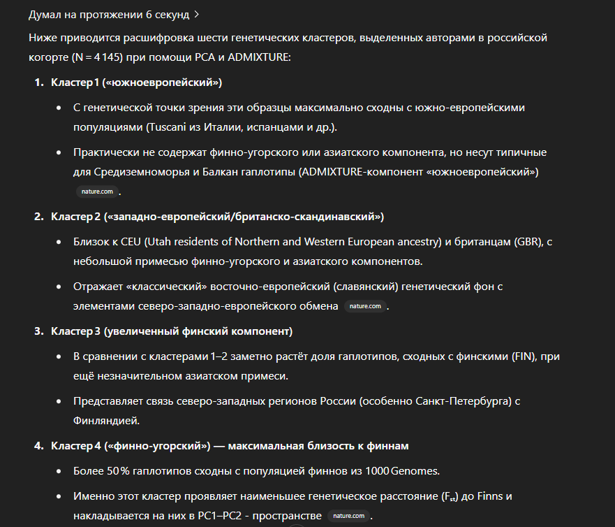 >>991860 Так у меня не русская гаплогруппа, завтра я отправлю слюну в генопоиск и там мне скажут субклад. >>991861 >См. Второй пикрил не считается, там всего два источника, на третьем у тебя 4,6% крымские татары и другие азиаты. Илюха ты русский с примесью мордвы и татар. >>991862 Не рвись Илюх, мы все здесь неидеальны, у тебя примесь мордвы и татар, у Стасяна тоже мордва, Саня на четверть азиат, Серега армянин наполовину, у меня гаплогруппа хача.