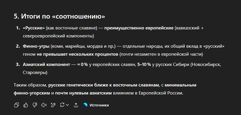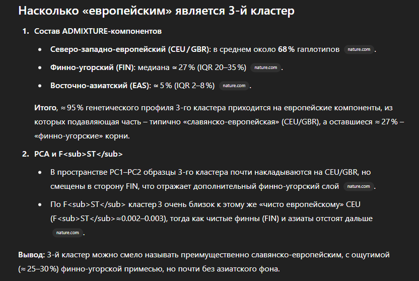 >>991866 >там всего два источника Эта модель показывает, что у меня нет дополнительной азиатской примеси по сравнению с восточными украинцами. Я ровно настолько же азиат, насколько и они. >на третьем у тебя 4,6% крымские татары и другие азиаты Это уравновешивает 20% поляков. Почему вы уже 5 лет не можете понять, что такое пца?