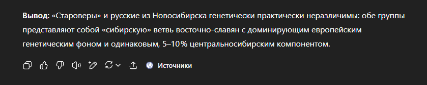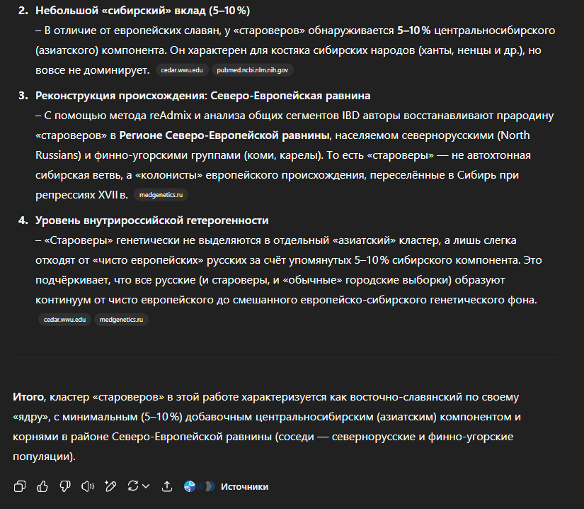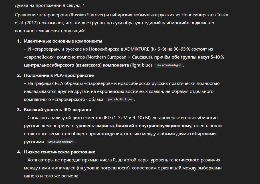 >С помощью метода reAdmix и анализа общих сегментов IBD авторы восстанавливают прародину «староверов» в Регионе Северо‑Европейской равнины, населяемом севернорусскими (North Russians) и финно‑угорскими группами (коми, карелы). То есть «староверы» — не автохтонная сибирская ветвь, а «колонисты» европейского происхождения, переселённые в Сибирь при репрессиях XVIIв.