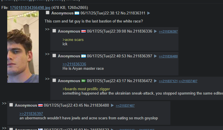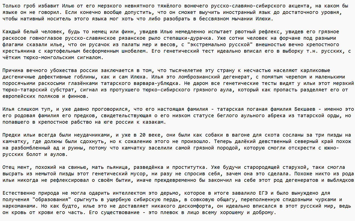 Naturally, nature could not endow this shit with intelligence, which eventually failed the Unified State Exam and had to regurgitate in a flawed Siberian fart, in a Soviet dorm overflowing with speedy churkas and drug addicts to get an "education". But it's as if Ilya doesn't have any discomfort with this, he fits perfectly into this Russian world, because he is blood from blood part of it. His existence is a spit in the face of all that is good and kind.