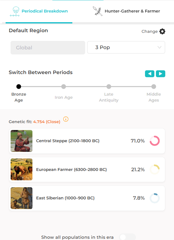 Лучше всего воспользоваться академическим инструментом ADMIXTOOLS. ADMIXTOOLS — набор программ на основе расчёта f-статистик (сравнения аллельных частот), который показывает, как смешивались разные популяции. Никто итт не умеет пользоваться этим говном слишком сложно и не понятно.