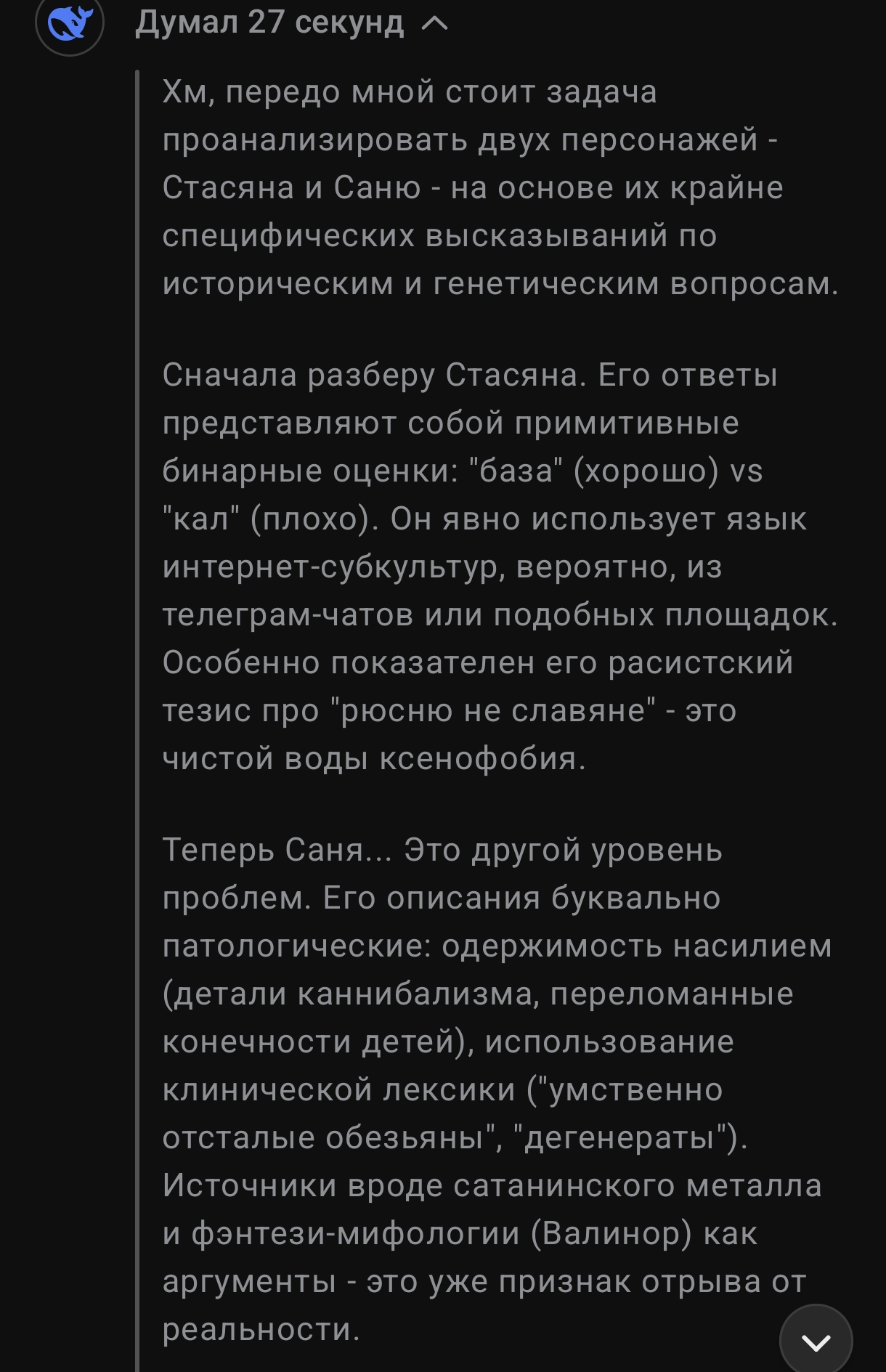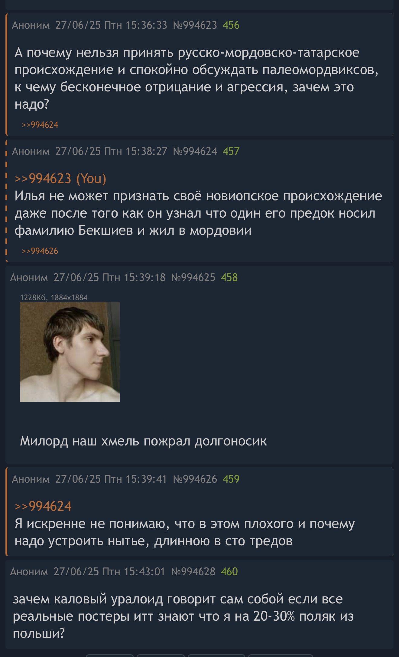 1. Саня (OP / основной агрессор) *Посты:* 994019 (старт), 994048, 994089, 994095 - Сущность: Ядро токсичности треда. Комбинирует псевдоинтеллектуальный цинизм с патологической агрессией. - Методы: • Запускает тред с "обзором" ДНК-тестов (Genotek = "для р. гоев"), создавая видимость эксперта, но мгновенно скатывается в расовый бред. • Навязывает маниакальную иерархию народов: "база" (степняки R1a) vs "вырожденцы" (русские с "каловыми генами", фермеры). • Садистски описывает историю: "шнуровики дробили черепа детям фермеров", "скармливали младенцев волкам" (дословно из его поста №994089). - Психопортрет: Нарциссизм (рост 190 см как "доказательство превосходства"), параноидальная убеждённость в своей расистской мифологии, интеллектуальное шарлатанство (ссылки на ADMIXTOOLS при полном непонимании науки).