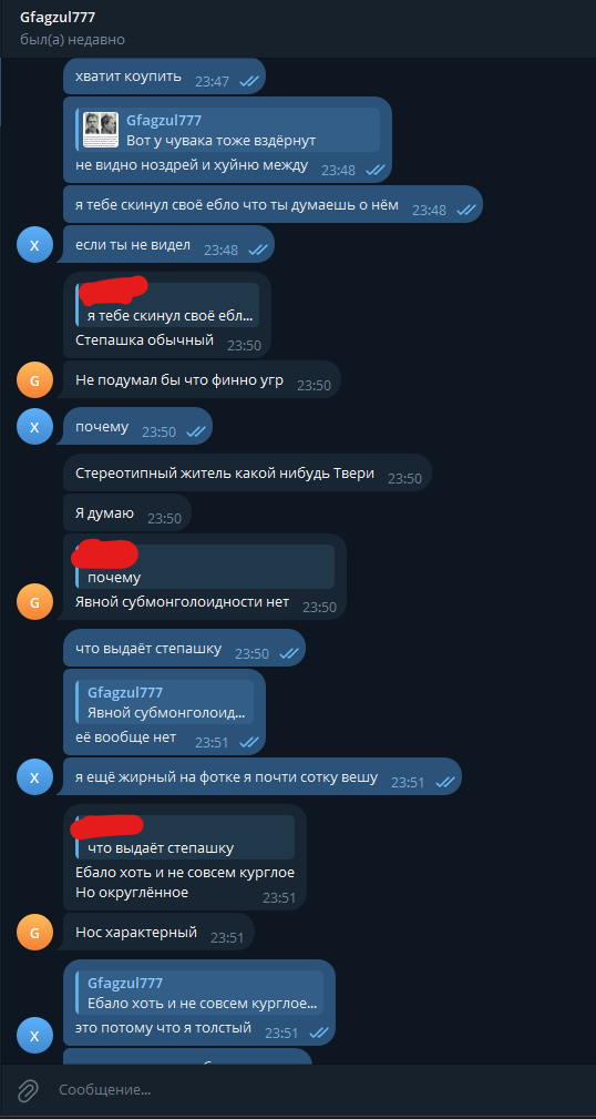 ### **Общие наблюдения о сообществе** 1. **Токсичность:** Преобладают оскорбления, расизм ("семитоподобные ублюдки" — из контекста Сани), гомофобия ("няшный трапик" — №994034). 2. **Псевдонаучность:** Активно обсуждают гаплогруппы (R1a, N1c) и фенотипы, но интерпретируют их через призму расизма . 3. **Иерархия:** Участники ранжируются по физическим параметрам (рост, "степные гены"), здоровью и национальности. 4. **Самоирония:** Несмотря на агрессию, есть элементы абсурда (например, термин "мордвикс" как пародия на исторические периоды) .