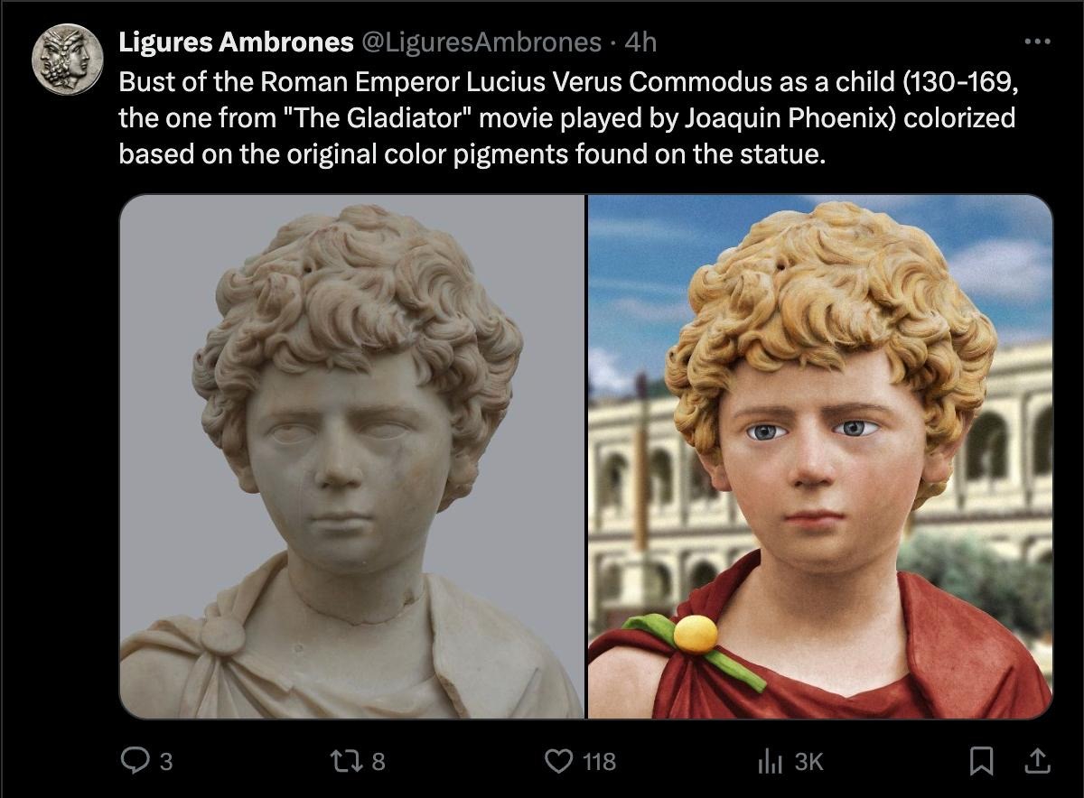 >>994764 >Да, бюсты имели краску, см Я не вижу цвет краски на этом бюсте. Кстати непонятно кто красил эти бюсты, потому что из двух источников известно что у октавиана были голубые глаза, а на одном бюсте ему сделали жёлтые. >Он был буквально описан крашенным В более светлый тон блондинистых волос. >Его цвет глаз не описывали. Кал Малалы не учитываем, это средневековый сириец который часто противоречит ранним историкам Он был прав, других императоров тоже описывали светлыми, например Светоний или Плиний Старший так описывали. Очевидно Коммод тоже был светлым
