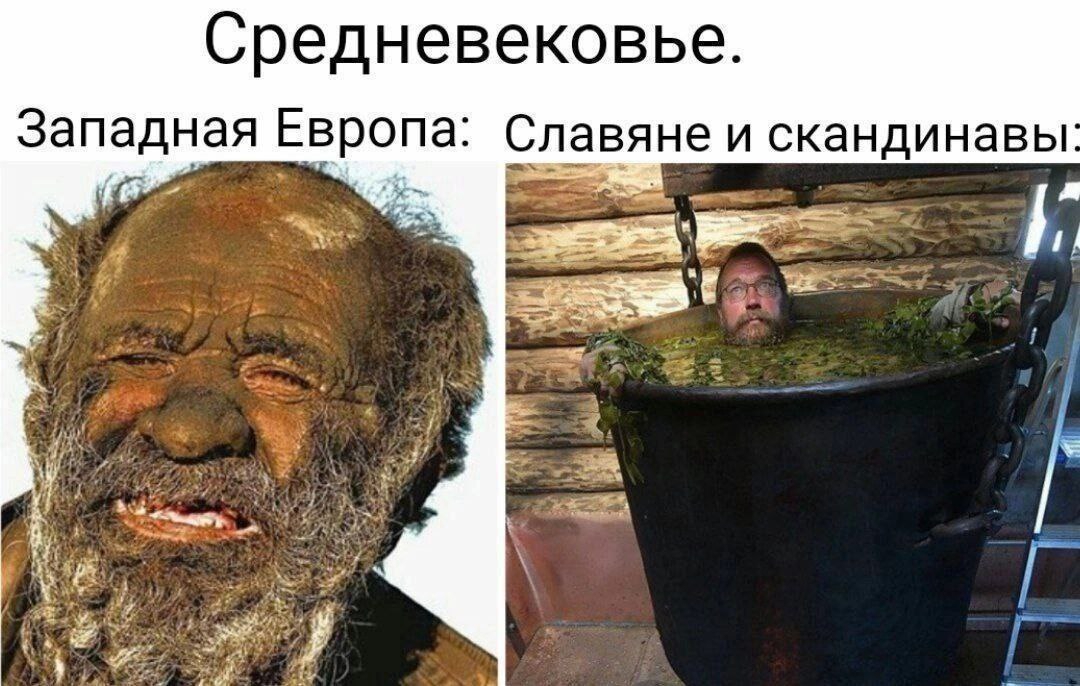 https://en.wikipedia.org/wiki/Ahmad_ibn_Fadlan >Русы появляются как торговцы, которые открыли магазин на берегах реки недалеко от лагеря Болгар. Они описываются как имеющие тела высотой с (финиковые) пальмы, со светлыми волосами и румяной кожей. Каждый из них татуирован от «кончиков пальцев ног до шеи» темно-синими или темно-зелеными «рисунками», и все мужчины вооружены топором, мечом и длинным ножом. >Ибн Фадлан описывает русов как идеальные физические образцы, а гигиену русиййа как отвратительную и бесстыдную, особенно в отношении секса (который они совершают открыто даже в группах), и считает их вульгарными и бесхитростными. В этом его рассказ контрастирует с рассказом путешественника Ибн Рустаха , чьи впечатления о русах были более благоприятными, хотя это было приписано, возможно, преднамеренному неправильному переводу, поскольку оригинальные тексты больше соответствовали повествованию Ибн Фадлана. Он также очень подробно описывает похороны одного из их вождей ( погребение на корабле с человеческим жертвоприношением ). Некоторые ученые полагают, что это произошло в современном комплексе Балымер >Они — самые грязные из всех созданий Божьих: они не очищаются после испражнения или мочеиспускания, не моются, находясь в состоянии ритуальной нечистоты после коитуса, и даже не моют руки после еды. — Ибн Фадлан