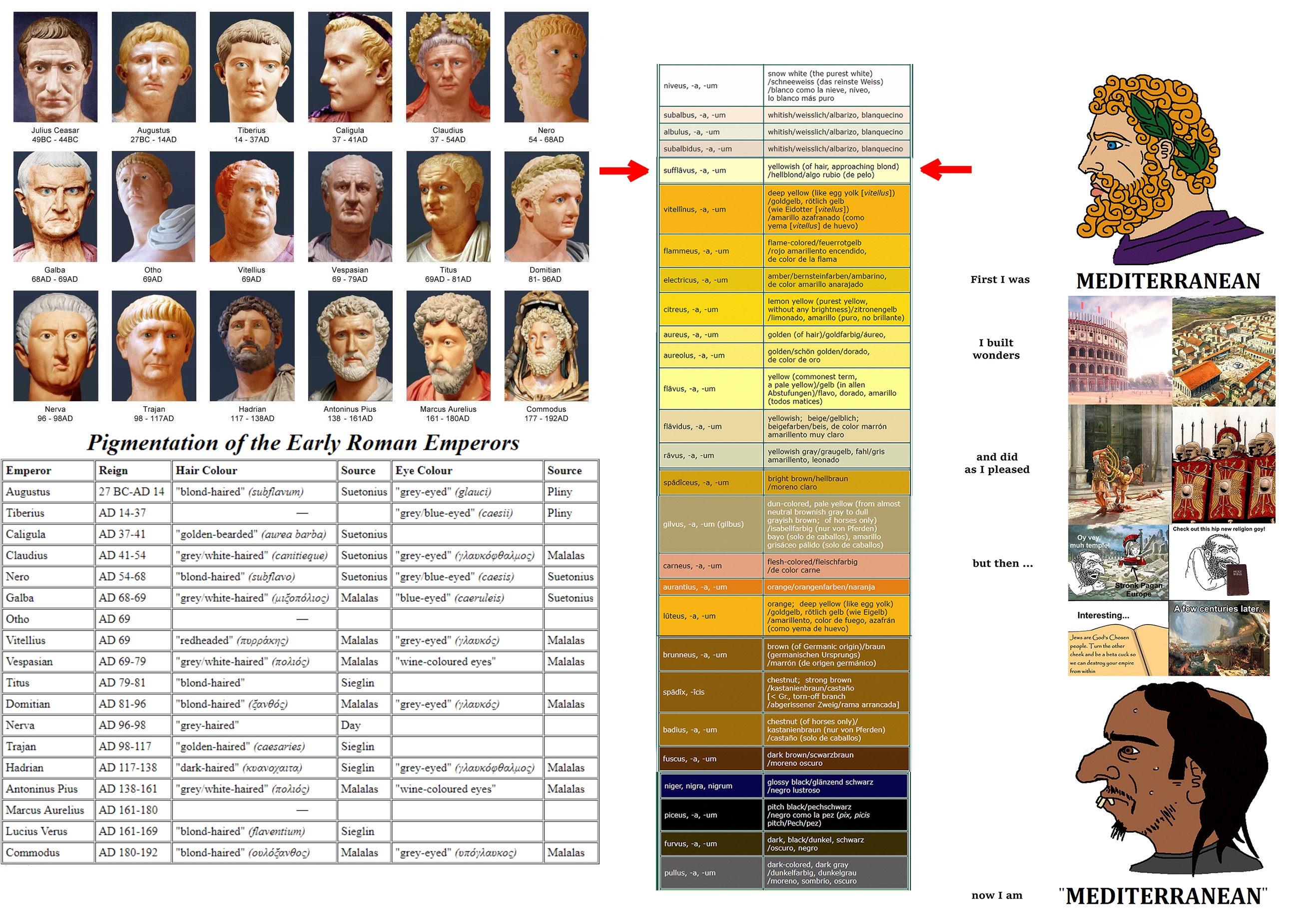 >>994777 >К светлым волосам нормально относились, в Греции многие мифологические герои были русыми. Светлые глаза не любили. Светлые волосы обычно идут вместе со светлыми глазами >Римляне были в 2 раза менее северными, чем современные южные славяне например. Но почему то южные славяне это чурки, а римляне это белые степняки арийцы. Интеллектуальная честность на высоте. Однако императоры рима были светлыми, а даже южные славяне в основном нет. Почему так?