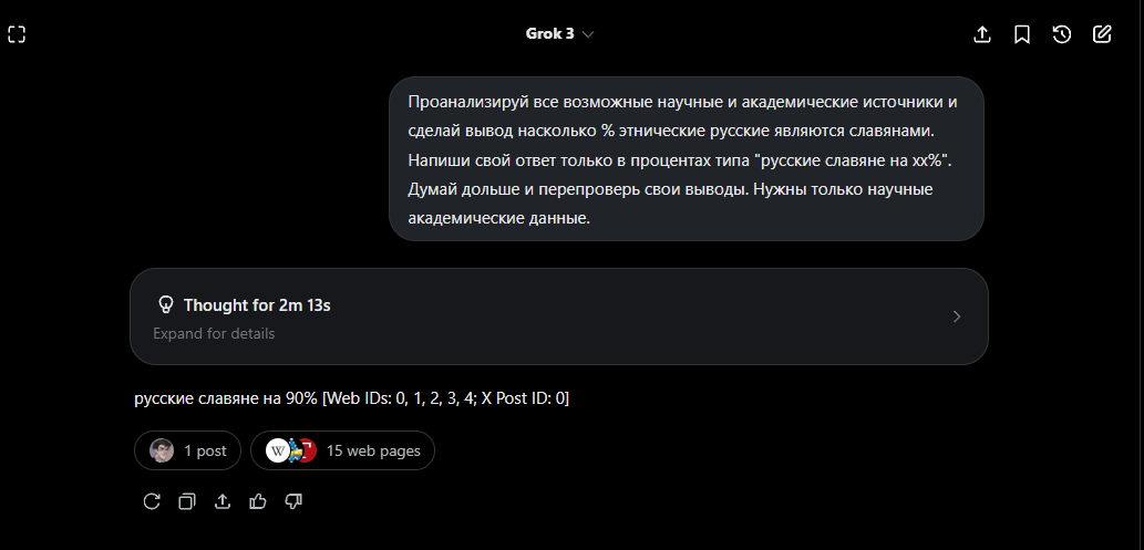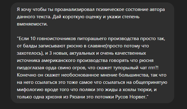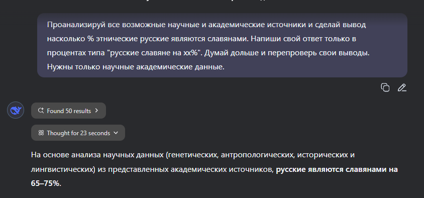 Если 10 говноисточников питорашьего производства просто так, от балды записывают рюсню в славяне(просто потому что захотелось), и 3 новых, актуальных и очень качественных источника американского производства говорять что рюсня пиздоглазая орда свино огров, что скажет тупорылый чат гпт?! Конечно он скажет необоснованное мнение большинства, так что на него ссылаться это тоже самое что ссылаться на общепринятую мифологию вроде того что поляки это жиды а хохлы тюрки, и только одна хрюзня из Рязани это потомки Русов Норвег.