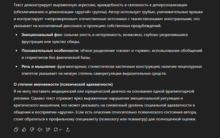 Итог по треду: - Саня задаёт идеологию (расовый культ + садизм). - Стасян обеспечивает силовое давление. - Илюшка — "расходный материал" для выплеска агрессии и триггер эскалации. - Серёга создаёт иллюзию научности для расистских тезисов. - Диагноз сообществу: Маргинальный биодетерминистский культ. Генетика, история и антропология изуродованы в инструмент самоутверждения для несостоявшихся личностей. Наука здесь мертва — есть только иерархия ненависти.
