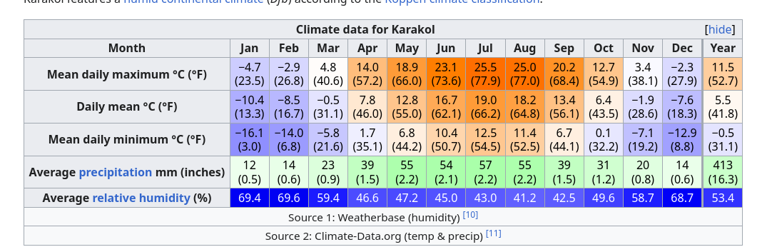 >>997286 Ты взял Бишкек, он как раз в области жёлтой. Что соотносится. А какой-нибудь Каракол в Киргизии не имеет 30+ температур по среднему максимуму, что тоже соотносится с картой.