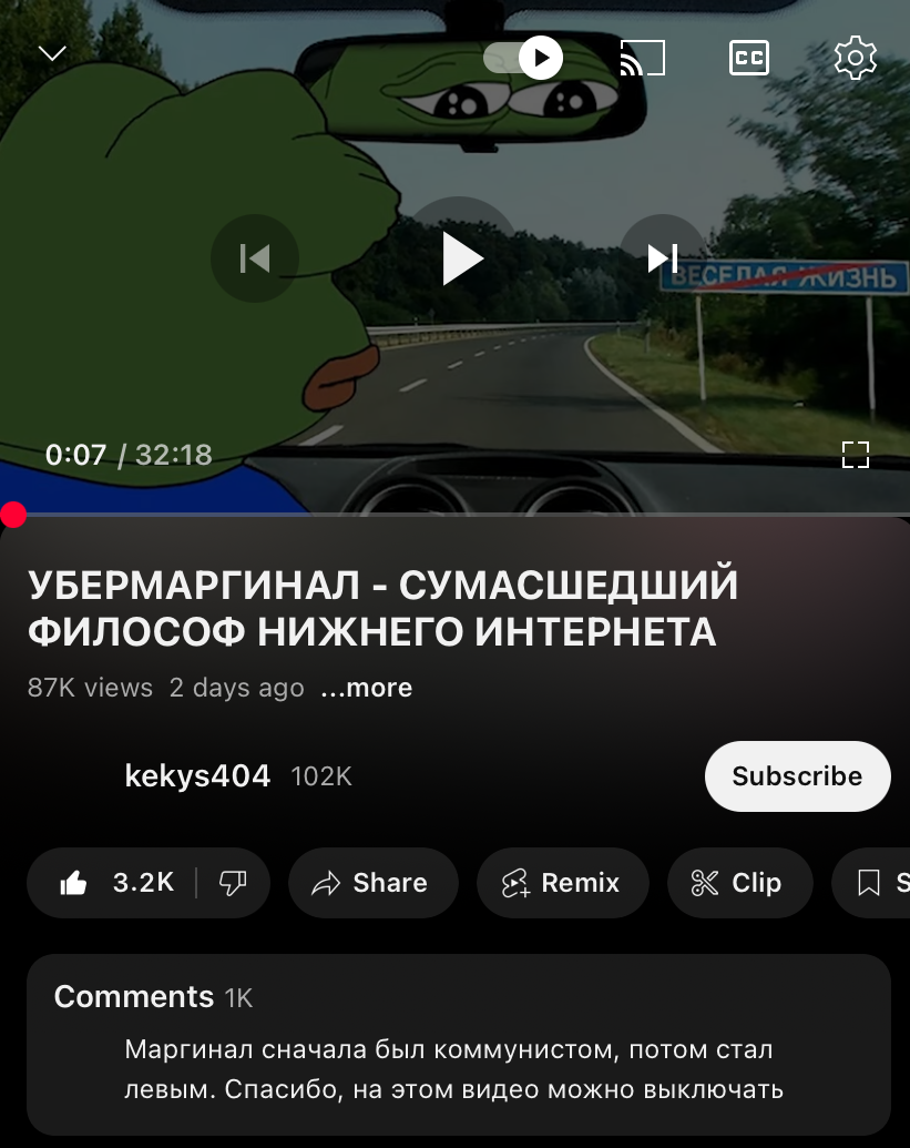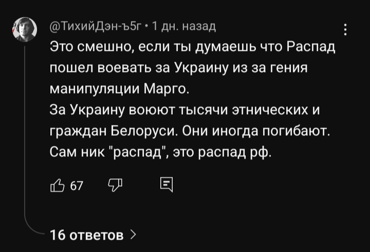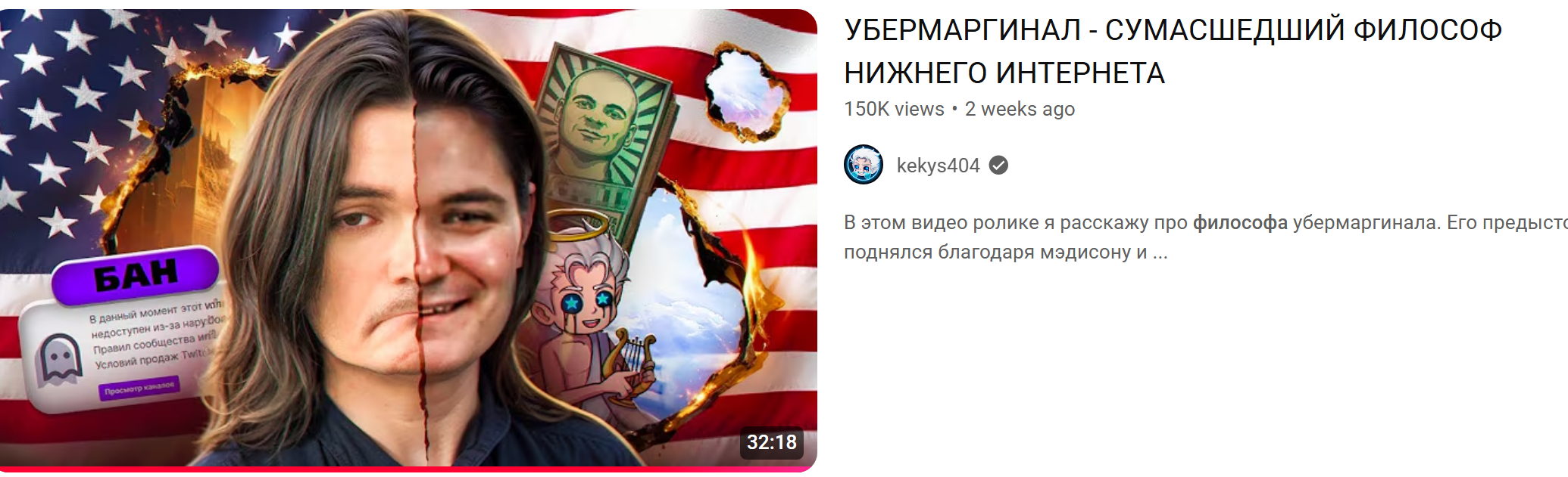 А маргинал может сделать всё вышеописанное вообще с любой позицией, и при этом нет никакой конкретной позиции, с которой для него это было бы проще или сложнее. Я его стал чуть больше уважать, когда он выраженно и идейно занял внятную сторону в отношении войны - крайне несвойственное для него явление, но затем он и на это хуй забил и забыл, переключившись на занюхивание каждого обдриста Трампа. Обычно такое называют "флюгер", но в случае с маргиналом ветром для этого флюгера является исключительно повестка срачей в интернете, судя по всему. Ну то есть в 2014, когда был на взлёте атеистический контент, у него были срачи про аборты, к 2018, когда шумел Навальный, он корешил с Просвирниным и рассказывал про русский Донбасс, к 2022 втопил за Украину и войну до победного, а сейчас потихоньку придвигается 2026 и он уже переключается в откровенную шизофорчканутость и MIGA. Условно у Светки такой жирный разворот произошёл только вот сейчас и все охуели, а у марго прям отработанный цикл фаз, можно часы сверять.