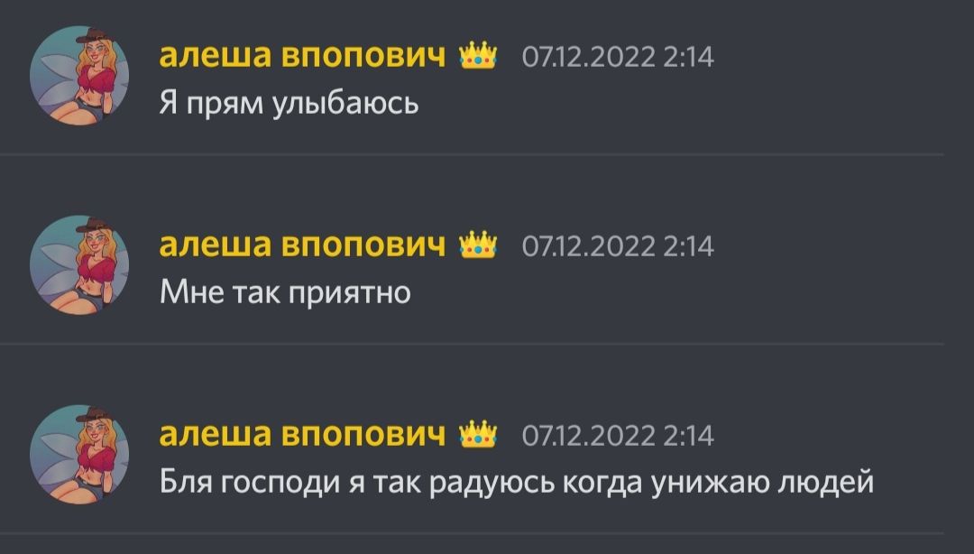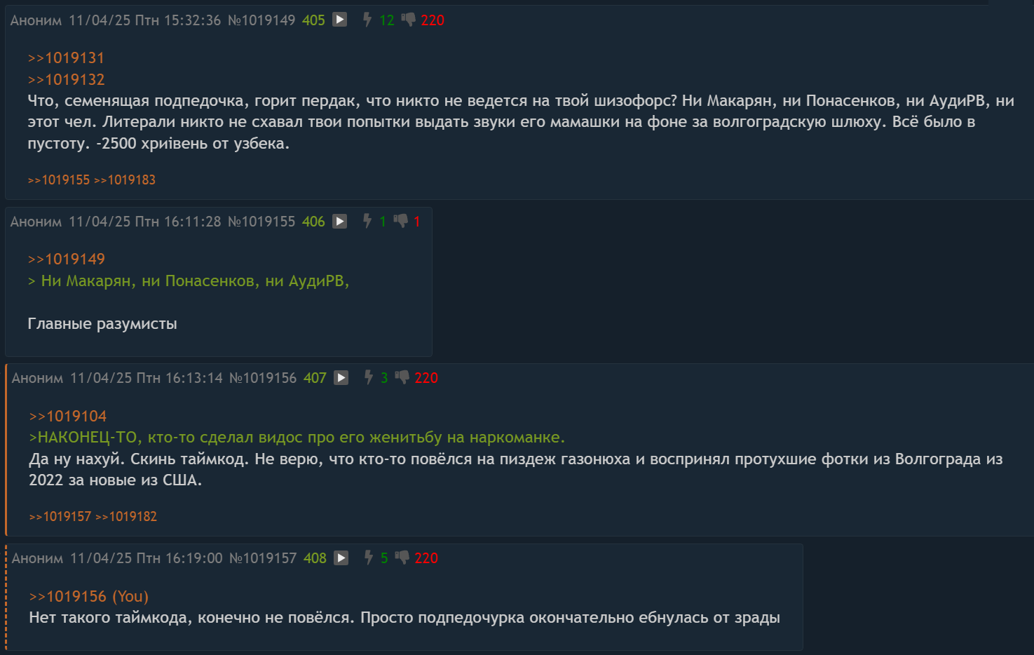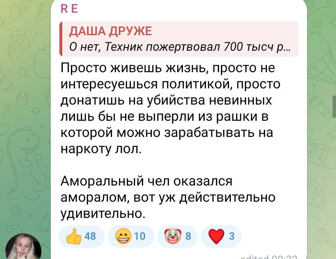 В чате пожелания смерти и обещания убить (скрин "подрыва" ручного зверька Сороколетовой, который в Азове сейчас на БПЛА, вроде как). То есть ни честной дискуссии, ни каких-либо положительных эмоций от этих коллабов вроде как быть не может. Если только ему не нравится ненависть в свой адрес.