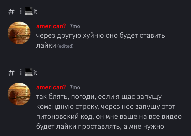 >>1015692 бля, не дописал. он забил на ирину и регнулся в тиндере, там не получил ни одного лайка, Ян Симнер посмеялся над этим и Чмо ему в своем дискорде уменьшил привилегию на одну ступень