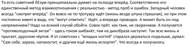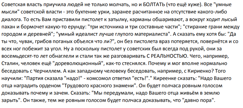 При этом не сказать, чтобы он прям откровенно тупорылый, по отдельности большинство его тезисов достаточно корректно звучат, но общая картина показывает, что, даже будучи в целом приемлемым теоретиком, как практик он абсолютно бездарный дегрод. Ему бы следовало быть колумнистом или писать книжки, но строить из себя мыслителя на стримах ему явно не хватает способностей. Как для контентмейкера это мб даже и неплохо, впрочем, главное хру не открывать и на посты с разбором себя не нарываться, а то так можно не только спиться, но и вздернуться по итогу.