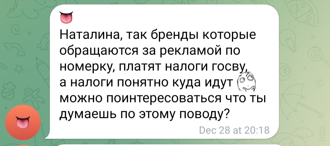 >>1021747 >Наталина, так бренды которые обращаются за рекламой по номерку, платят налоги госву, а налоги понятно куда идут (ой, какой кошмар!) Можно поинтересоваться что ты думаешь по этому поводу?