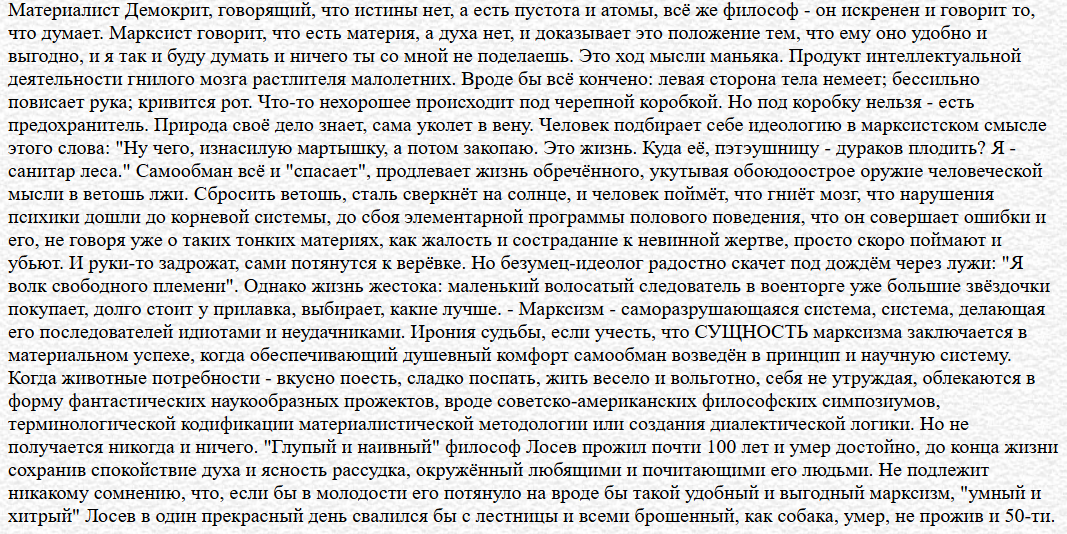 Я раньше думал, что может для него мерилом ценностей является логичность и внутренняя непротиворечивость, ну то есть базис философии как идеализированного явления в вакууме. Но потом понял, что он просто нпц-долбоёб с тоннами когнитивных ошибок и аргументацией уровня экспертов с шоу помёта, и все эти концепты, к которым он любит прибегать в случае обсера (базис теории, плюрализм восприятия, етц) он на хую вертел, когда они используются в любой роли, отличной от его переобувки на лету. По факту единственная объективная ценностная шкала, которую лично я могу выцепить у маргинала, это уровень согласия и несогласия с ним самим.