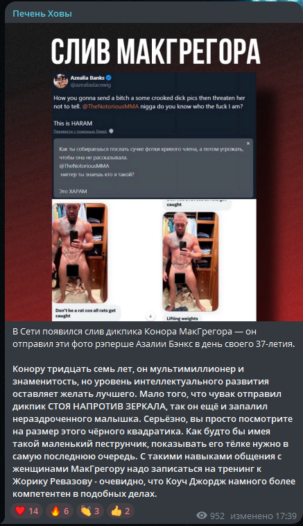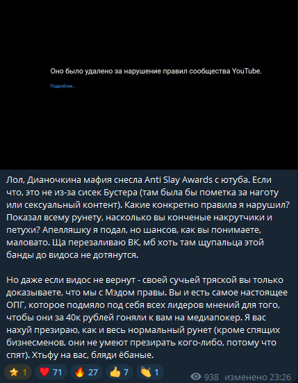 Да даже если после, это не могло быть ответкой, т.к. тогда никто нихуя не знал. И на этот осуждаемый отрывок никто особого внимания не обратил. Даже мыслей ни у кого не было, что за него могут привлечь Газонюха. Он больше тогда парился по поводу своего спича в ТГ про Приклад и Коммунистов. Даже деда выдумал, которого те убили, чтоб оправдаться.