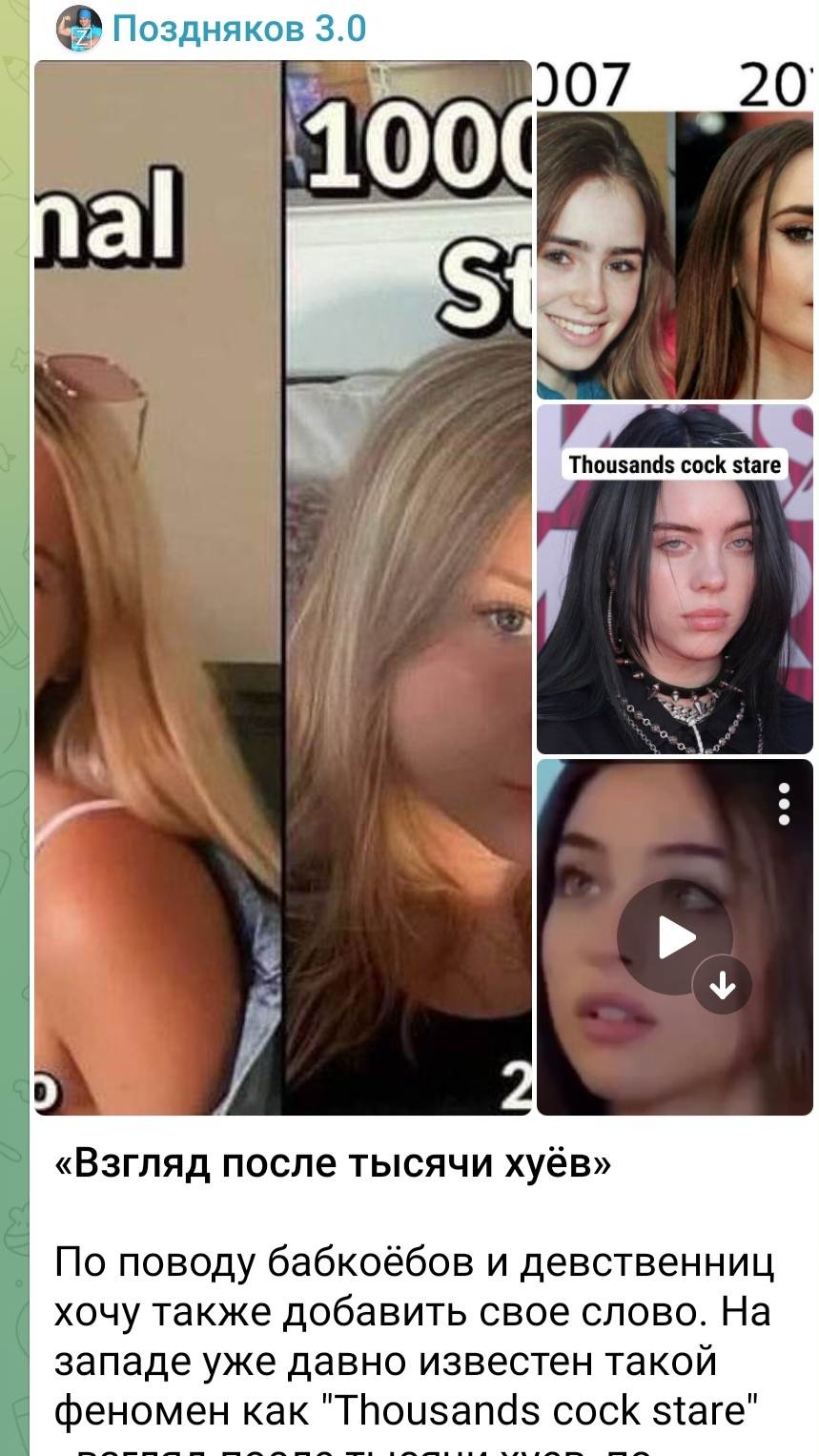 > 3 одинаковых скрина Пиздлявая попдпедочурка, только на этом >>1040350 мемасе уже 4 разных поста с форсом. Это лишь то, что было на поверхности, никто не хочет ковыряться в 20к отправленных сообщениях казахского газонюха. Плюс как минимум 4 поста в срикере на первом скрине здесь >>1045599 И посты эти тоже от админа подпедочурки "Фольги". Какое совпадение, что шизу про жену форсят именно админы в дискорде и в тг.