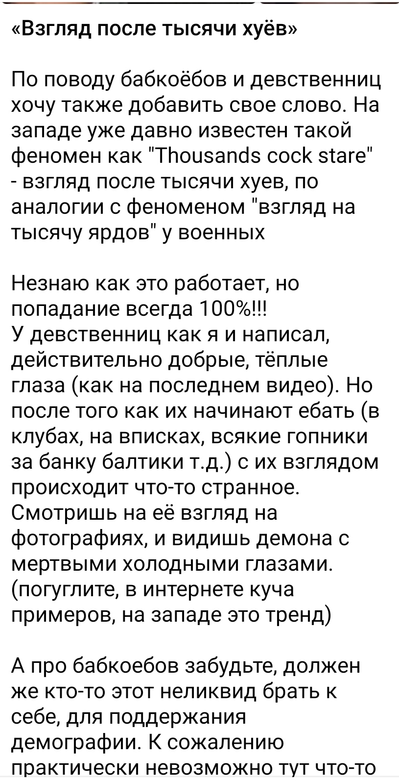 А вы заметили что в последнее время начало много людей сюда залетать с постами "вы чё ебанутые, сколько можно мусолить тему", "тут один шиз сам с собой спорить про инцельства и педофилию чма". Педочурка взялась за ум и перестала срать дебильными фотками из Волгограда?