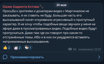 Герсон про Артамонова на стриме Кашина: "Маргинал нас давно не посещает. Вообще, я тут зашла к нему на стрим...У нас он был таким вежливым интеллигентным мальчиком, а на стриме он...Другой.я не сказала бы, что он хуже или лучше был, просто другой. Он, конечно, говорил, что у него времени нет, но я думаю, что дело в чëм-то другом, чего я не знаю".