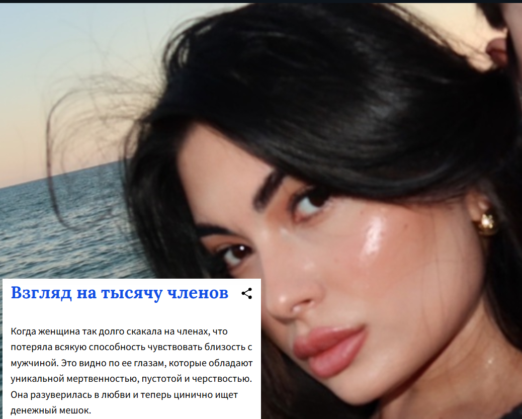 Возможно весь ум остался в груди, но я не против. Меня просто возбуждают базовые тейки от баб про гнилых хохлов и победу, про великого Путина. А размер груди отлично дополняет картину.