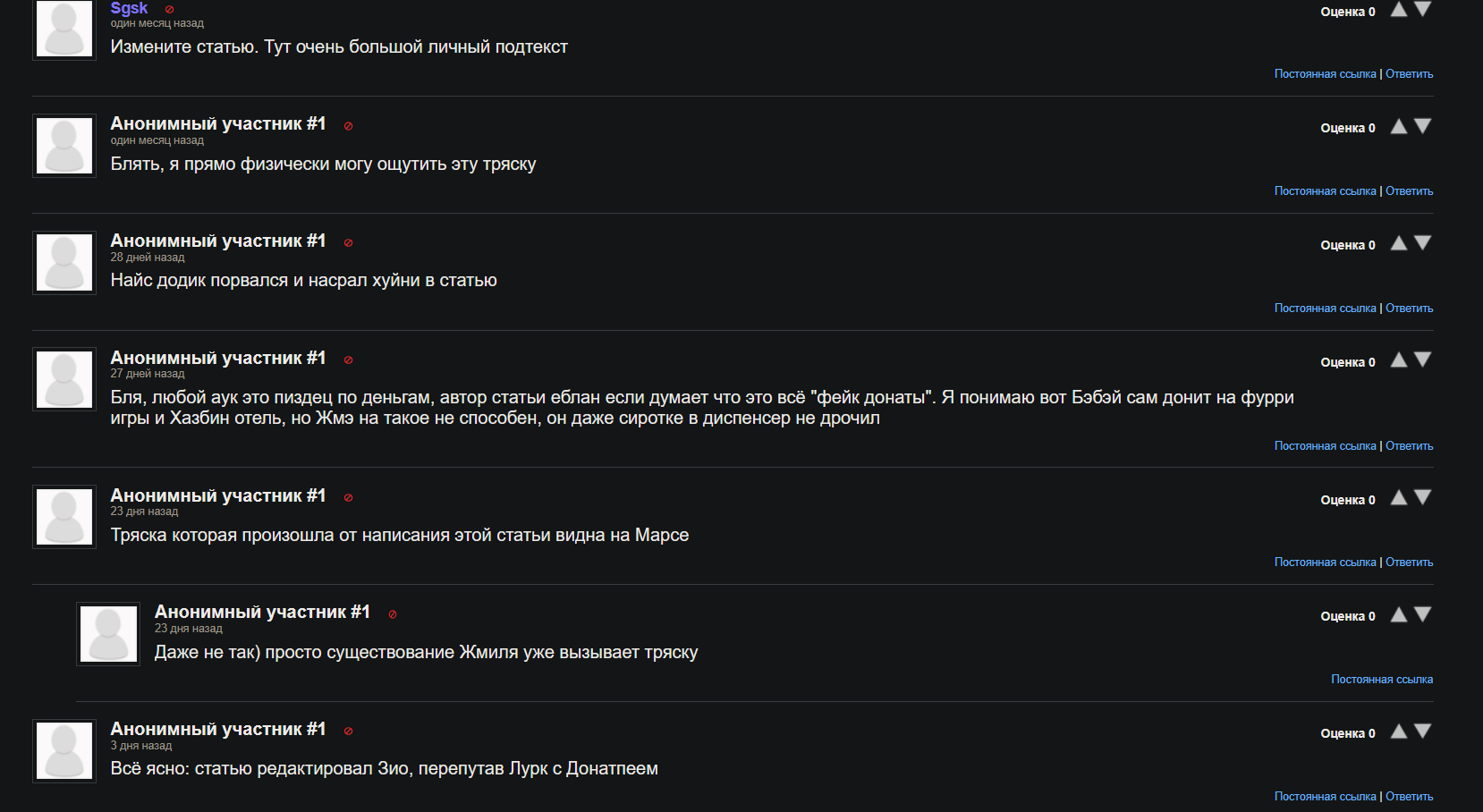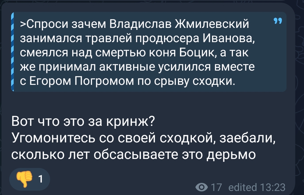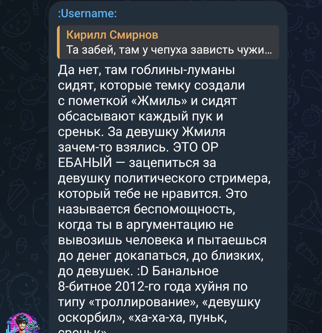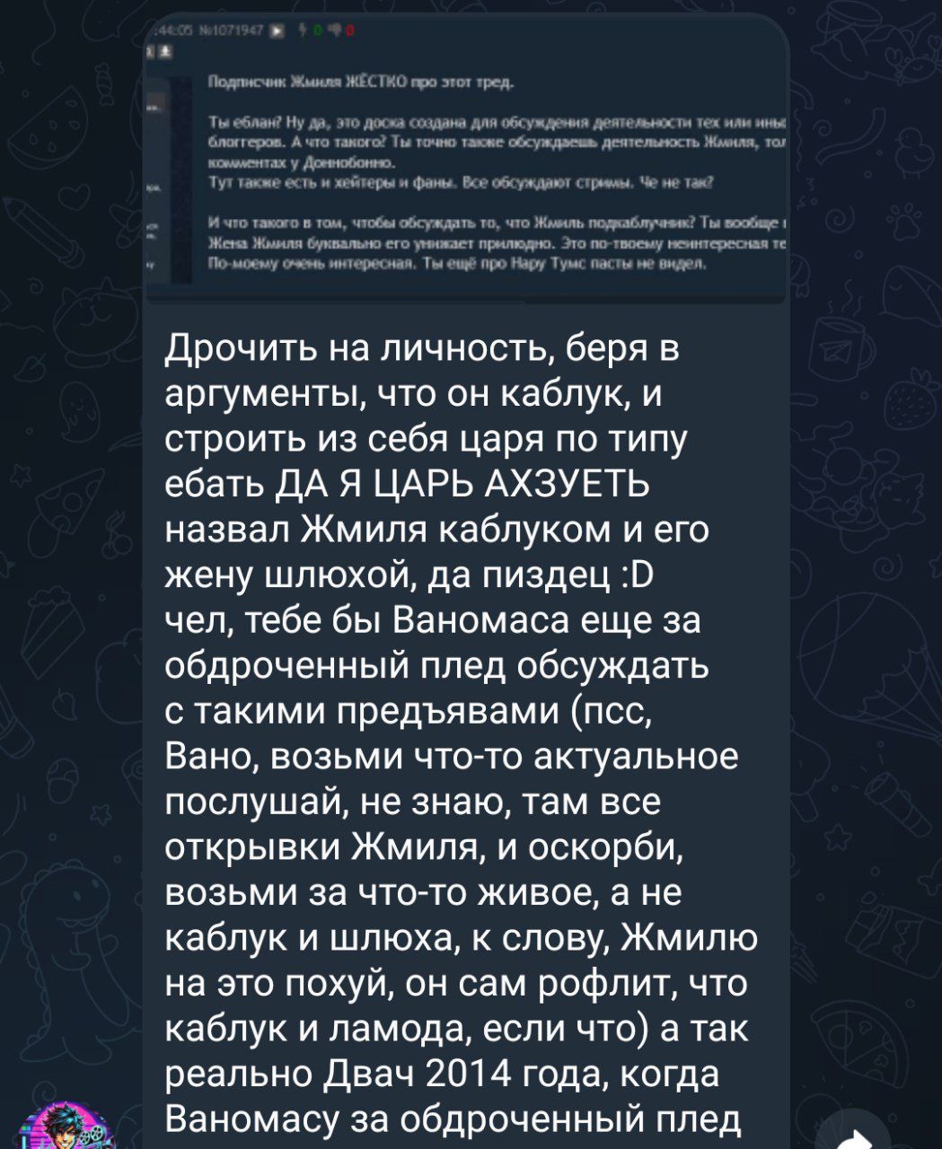 >я беру аргументы из треда ШиштоФФ, твой главный пойнт про Донецка взят из постов хейтеров, занимающимися шизопостингом про бимбу и Нару Тумус. Дам тебе генезис хейта Жмиля. В году 19/20 он начинал вести себя, как гниль на стримах и просто бухим кричать на своих зрилов Собственно кличку гниль дал ему Никита Ветровего бывший мод и один из топ донатеров, а так же человек помогавший с плагином для чата, когда от его имени кто-то задонатил Жмлю видос с мертвым голубем. Петрозаводский алкаш сразу начал хуесостить своего друга и выдал пермач в чате. Ну, и ситуация с Апослотом после сходки, когда Жмиль после аутинга Апостола по тихому слил его из круга друзей и близкий. справедливости ради слитие совпало с уходом апостола из интернета Все, кроме этих двух случаев, натуральный шизопостинг самых сумасшедших газонюхов педоузбека из калового сликера, которые пятый год воют со Жмилем за срыв схотки. Так что ты себя добровольно записал в когорту психических больных. Ты просил мощный аргумент для спора на стриме? Даю из той же категории. Спроси зачем Владислав Жмилевский занимался травлей продюсера Иванова, смеялся над смертью коня Боцик, а так же принимал активные усилился вместе с Егором Погромом по срыву сходки.