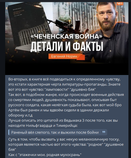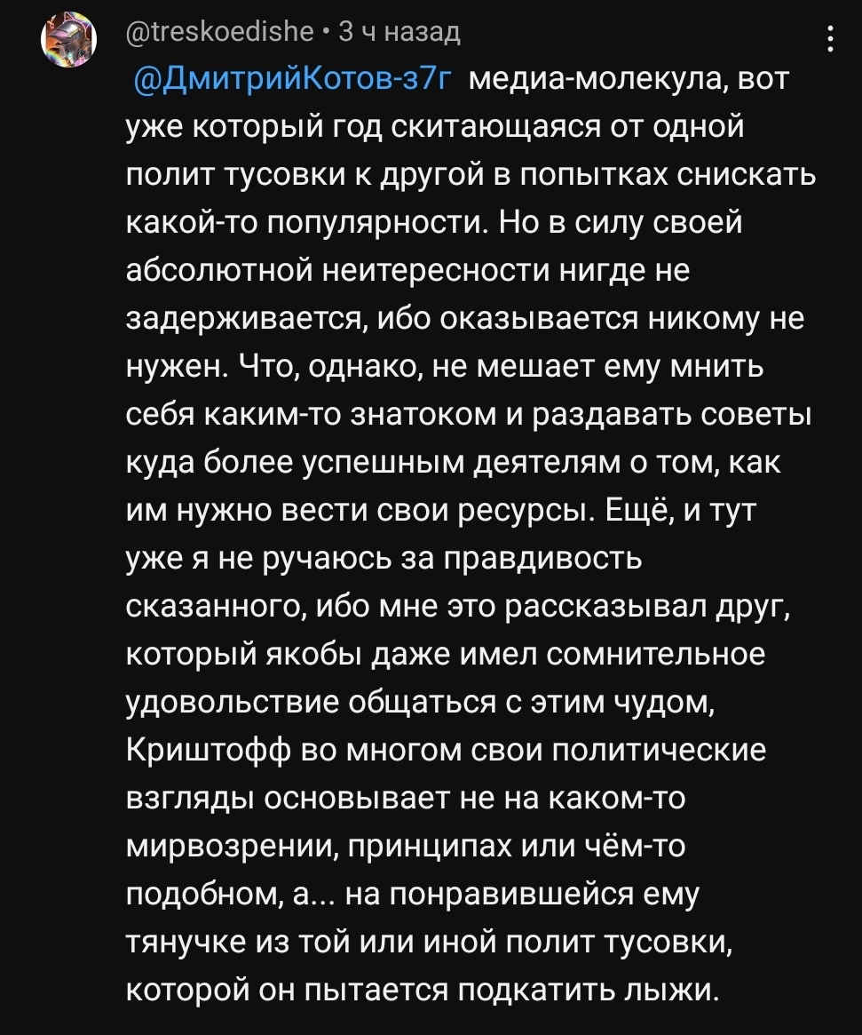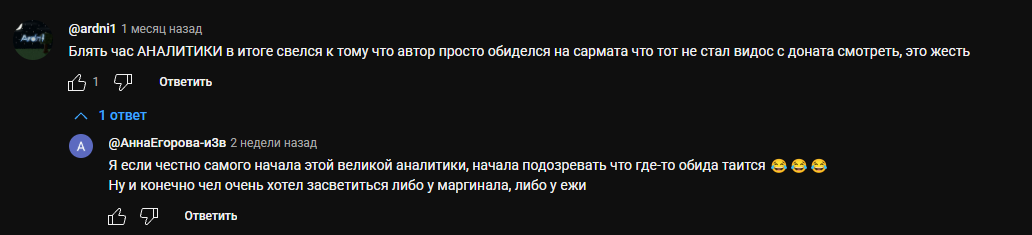 Сейчас на стриме Жмиль начал минут двадцать затирать за Дедпи, комментируя его вырезку со стрима, где тот отказывается постримить с карельским политологом. Ну это обычная тема, в треде местные снова бы навесили на Жмиля ярлык: "Хочет пиара, хитрый Жмилька" но меня затриггирело не это. Меня неприятно удивило то, как Жмиль стал разговаривать, с очень характерной манерой... внезапно силовика какого-то, которому надо раскрутить подозреваемого/свидетеля. А именно стал говорить: "Да что ты себе так удумал, никто не собирается тебя на ковер загонять. У меня и в мыслях не было спрашивать про щекотливые ситуации(Жмиль имел в виду про Крымский мост), я просто хотел поговорить на разные темы" - это же, сука, чисто как по учебнику, чисто замануха силовика. Я её узнаю, как родную. И вот спрашивается... это от Карпова и прочих сириков Жмиль перенял эту манеру, или откуда она у него вообще есть? Он же юрфак не окончил, в органах не служил...
