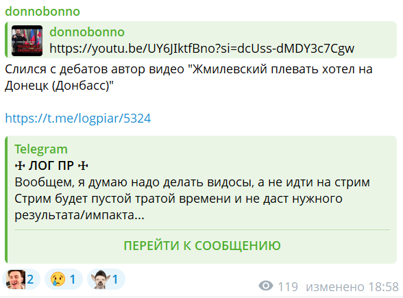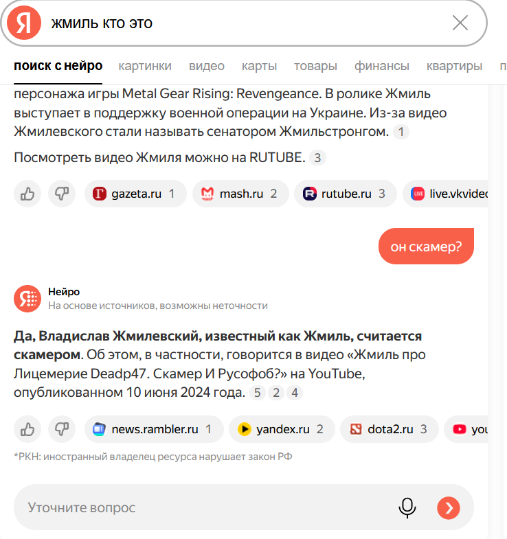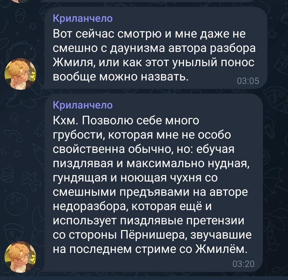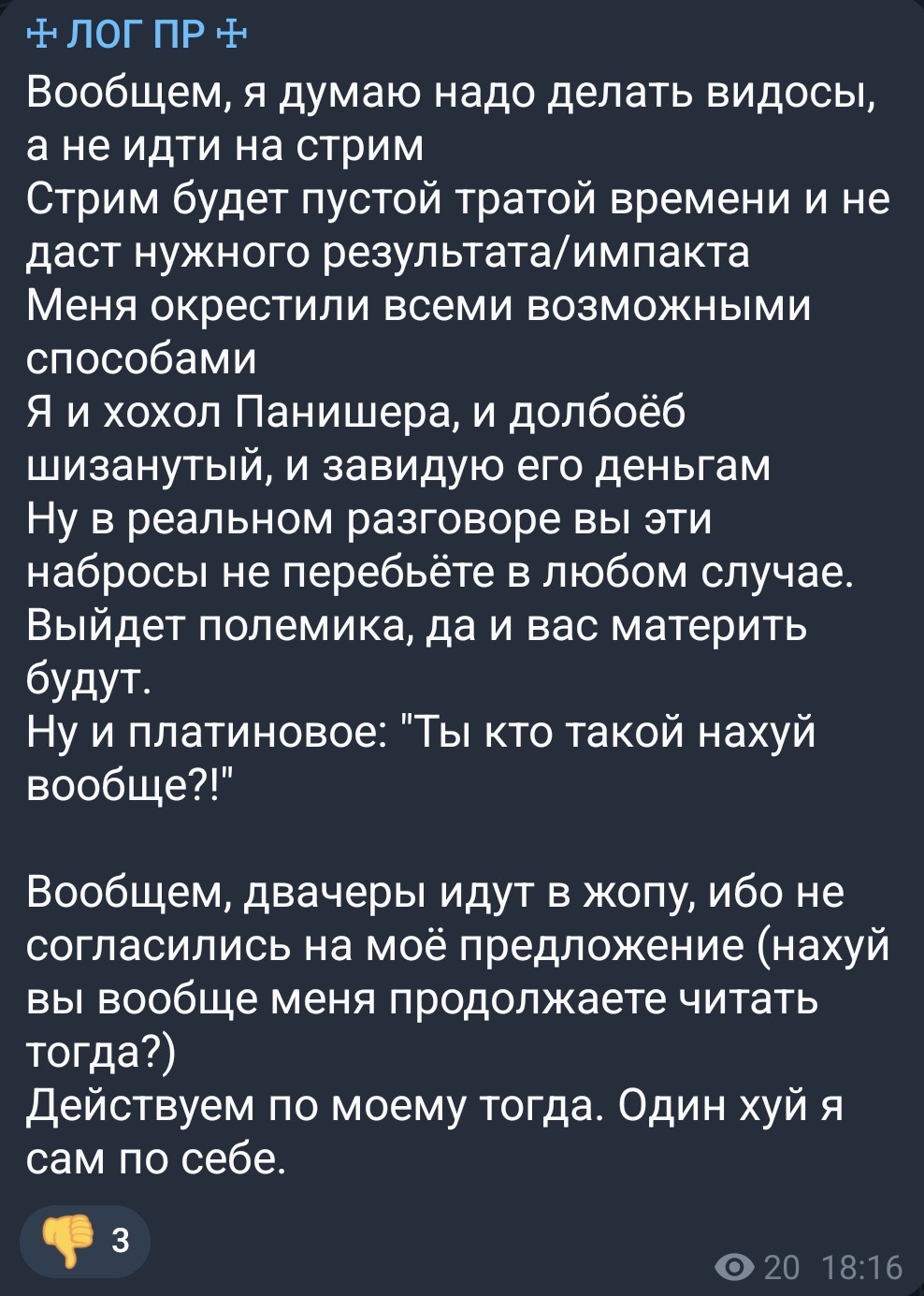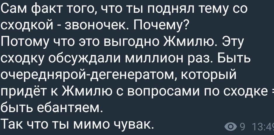 >АРРРРЯ РЕБЯТА ПОЧЕМУ ВЫ ПРОТИВ МЕНЯ(((( Я ЖЕ ТАКОЙ ЖЕ КАК И ВЫ ДВАЧЕР. И БУДУ ДЕБАТИРОВАТЬ С ЧМИЛЕМ((( ПОЧЕМУ ВЫ МЕНЯ НЕ ПОДДЕРЖИТЕ? ((( Да потому что ты нанёс полнейшую хуйню. Тебя вчера Жмиль на стриме просто разъебал без права на реабилитацию. Потому что ты снял хуйню, а не разоблачение. Если бы снял хорошее адекватное разоблачение, то претензий к тебе бы не было. А не "Жмиль должен поехать в Донецк потому что я так скозал. Штефанов же ездил, вот и Жмиль обязан. И что что у него буквально нет никакой цели чтоб туда съездить. И вообще ему донатят миллионы, мне завидно"