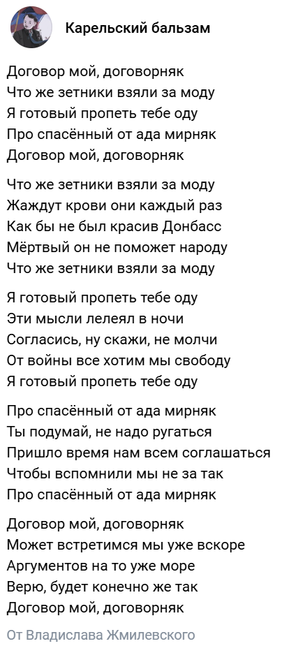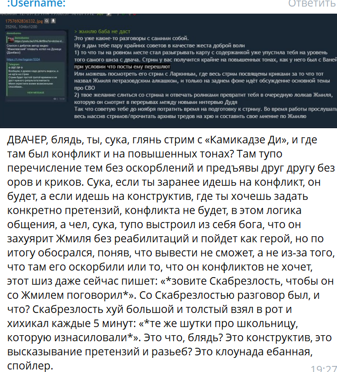 > жмилю баба не даст Это уже какие-то разговоры с самими собой. Ну я дам тебе пару крайних советов в качестве жеста доброй воли 1) то что ты на ровном месте стал разыгрывать карту с содержанкой уже упустила тебя на уровень того самого шиза с двача. Стрим у вас получится крайне на повышенных тонах, как у него был с Ваней при условии что посты ему перешлют Или можешь посмотреть его стрим с Ларкиным, где весь стрим посвящены криками за то что тот назвал Жмиля петразовдским алкашком, и только на заднем фоне идёт обсуждение основной темы про СВО 2) твое желание слиться со стрима и отвечать роликами превратит тебя в очередную лолкав Жмиля, которую он смотрит в перерывах между новыми интервью Дудя Так что советую тебе до ноября потратить время на подготовку к стриму. Во время работы прослушать весь массив стримов/прочитать архивы тредов на хрю и составить свое мнение по Жмилю
