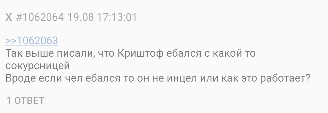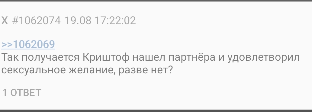Никому не интересный ноунейм не прекращает попыток набрать 130 подписчиков. Ничего, скоро упоминание Кр*иштофа будет официально запрещено правилами доски. Тогда заживём.