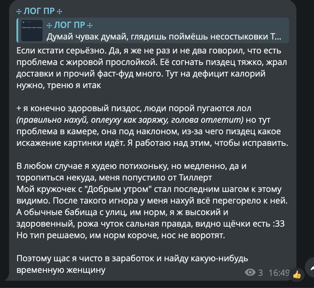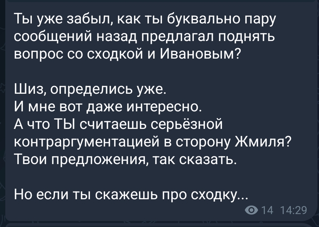 >Поэтому твой совет как раз и похож на шизов, которые задают тейки, где "добровольно записываю себя в когорту психически-больных" >Иначе бы они вели себя достойнее кмон. >Жмилю есть, что предьявлять, в том числе и за его патриотичную позицию. Если начну подымать тему сходки, что есть беспросветная тупизна, уж простите - я закопаю себя ещё до начала разговора буквально. Перечитай мой пост. Попробуй уловить то что сказано между строк, а вначале поста прямыми словами