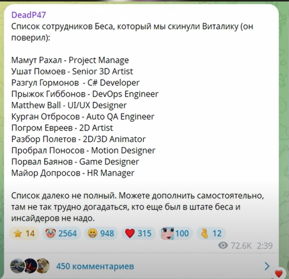 Почему подсосы витали не могут успокоится? Ну затралили малютку виталю. Бывает. Подумаешь дед будет хайпится на этой теме еще очень долго. Может сольет уже реальную инфу про виталю и его "правильную" позицию. Виталя сам подставился под удар. Пускай терпит малютка. Кста будь я игровым разрабом, я бы к этим двум белорусам на интервью ни за что бы не пошел. Таких стукачей и козлов не уважает никто