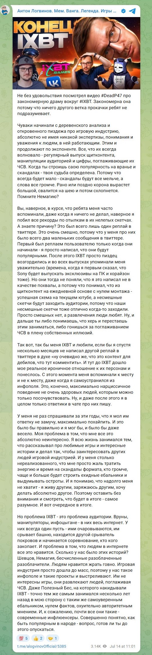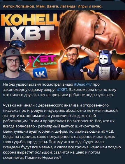 >буквально случайный блохер надел кепку Попрошу. Сговор блохеров, включая блохера по которому материал и готовился. Ему сказали молчать, тиме разработчиков сказали молчать, чтобы не перебить дезинфу, блохер в кепке наговорил хуйни, но эту хуйню подтвердило еще пара других засланых казачков. Если бы был только один блохер в кепке который наговорил хуйни, то он так бы и остался единственным шизом, а видео бы не вышло, если бы вышли на связь разрабы и ответили что всё збс (да да, не обязаны идти на поклон), то видео не вышло бы. Но вся эта компашка отлично сработала, как отлаженный механизм. Вот и вышло.