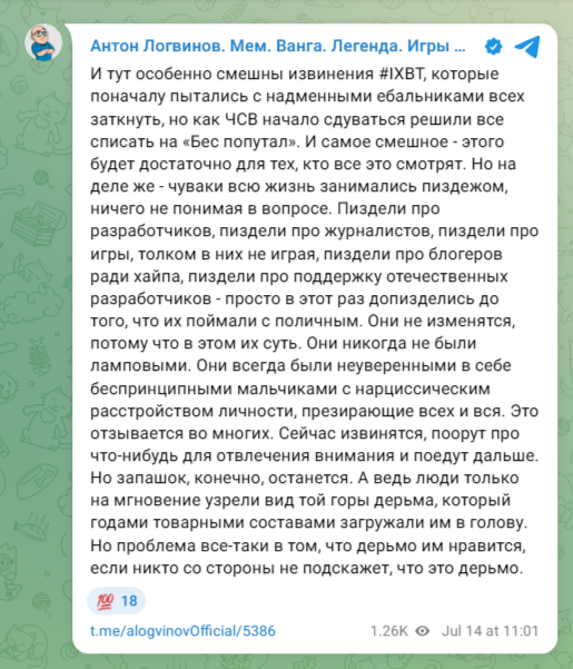 Серьезно, вы настолько ебанутые, что в сраче между геймерами видите какую-то политическую акцию? Чтобы что? После отписки от виталямбуса продать родину за русофобскую игру в амэриканском стиме?