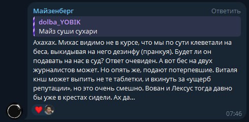 - Майзенберг прозрел насчёт русофобии Беса и пошел по стопам Витали - пытается закосить под душевнобольного алкаша.