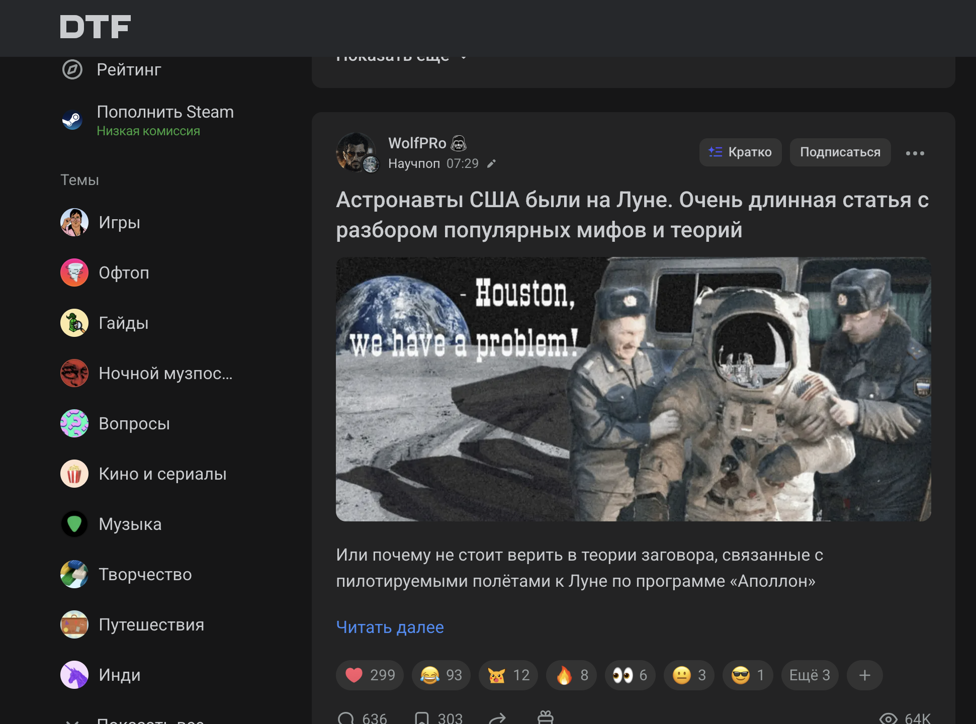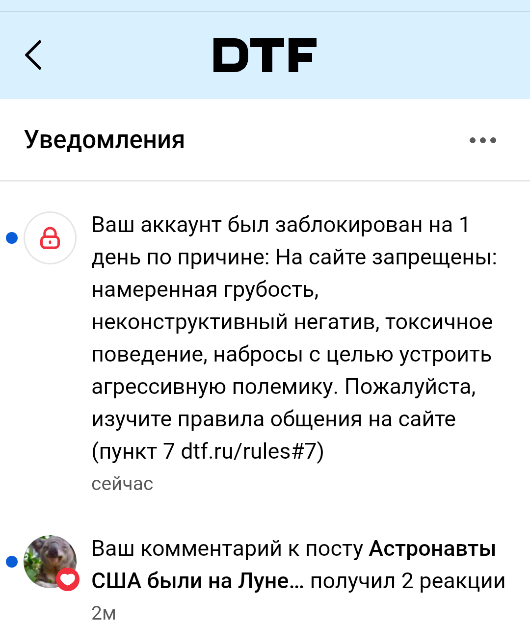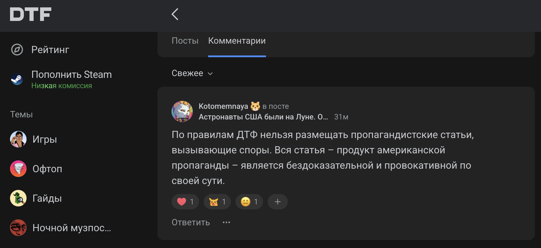 Утром на русскоязычном портале для гиков, на главной DTF.ru разместили статью прославляющую американскую космонавтику с явно провокационным контентом про полет американцев на Луну. Популярный блог KOTOMEMNAYA, который обратил на нарушение правил ДТФ, сразу же забанили. Всех, кто высказывается против американской космической программы шэдоубанят. Тут вам и нарушение конституционных прав, нарушение прав самого портала по отношению к тем, кто защищает научную точку зрения и выступает против пропаганды.