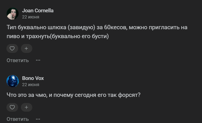 Вырожденцы, вы понимаете насколько вы жалкие по сравнению с Борисом? Он единолично, открыто бросает вызов миллионам вырожденцев, блогерам-миллионникам и лично Вадим Вадимычу. У вас хватило бы яиц на такое? Вот то то же. Все на что вы способны это чахло пиздеть в тредике, пока Борис бросает вызов практически всему миру