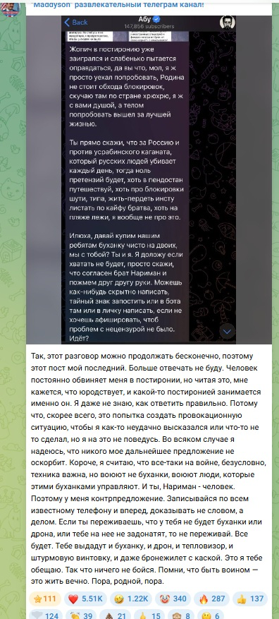 >призывов толика к бомбежкам МИРНОГО населения - это набутыливание его родных Хоть один такой кейс покажи. Даже родственникам предателей типа Кузьминова, которые нанесли серьезный дамаг и убили своих товарищей, ничего не сделали. А здесь просто ноунейм что-то пукает словами в интернете.