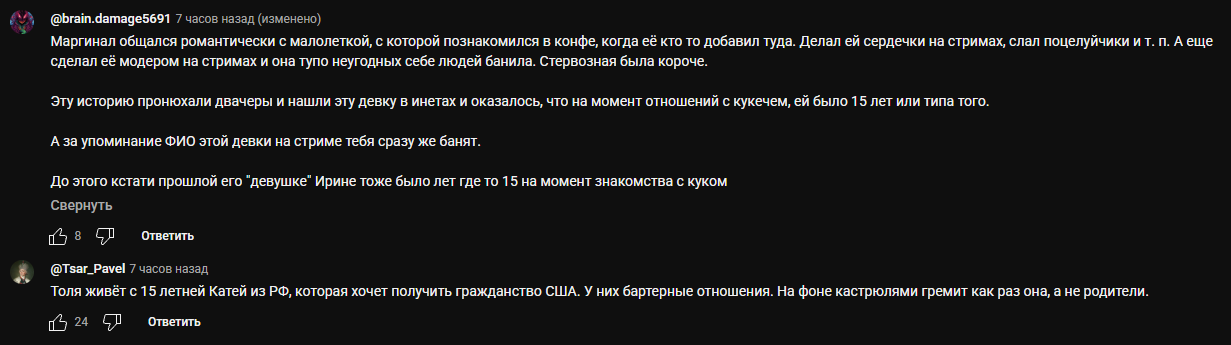>>1061898 Так он с той Настей впервые увиделся лично, когда ей 16 было, а списались, когда было 15.Да, были истории с трахеей в ЖЖ. Сороколетова пришла к Артамонову в Дискорд и в любви призналась за месяц до 14-летия, и через месяц он прислал обручальное кольцо. Встретились когда ей было 16 тоже. Картинки с младенцами на хуях, голыми школьницами и паблик "Пресс" на странице ВК. Так что либо оба педофилы, либо никто.