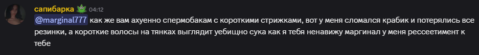>одним пуком Пиздлявая попдпедочурка, только на этом >>1040350 → мемасе уже 4 раза. Это лишь то, что было на поверхности, никто не хочет ковыряться в 20к отправленных сообщениях казахского газонюха. Плюс как минимум 4 поста в срикере на первом скрине здесь >>1045599 → И посты эти тоже от админа подпедочурки "Фольги". Какое совпадение, что шизу про жену форсят именно админы в дискорде и в тг.
