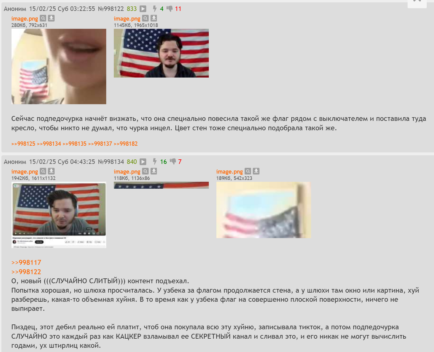 У узбека за флагом продолжается стена, а у шлюхи там окно или картина, хуй разберешь, какая-то объемная хуйня. В то время как у узбека флаг на совершенно плоской поверхности, ничего не выпирает. Пиздец, этот дебил реально ей платит, чтоб она покупала всю эту хуйню, записывала тикток, а потом подпедочурка СЛУЧАЙНО это каждый раз как КАЦКЕР взламывал ее СЕКРЕТНЫЙ канал и сливал это, и его никак не могут вычислить годами, ух штирлиц какой.
