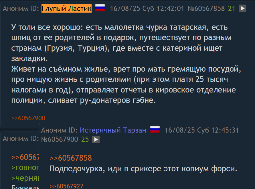 Каждый пункт подкреплён фотками и скринами, у перефорсной подпедочурки нет ничего, она просто визжит, что чурка живёт с родителями и постит старые фотки из Волгограда, сделанные до переезда в 2023.