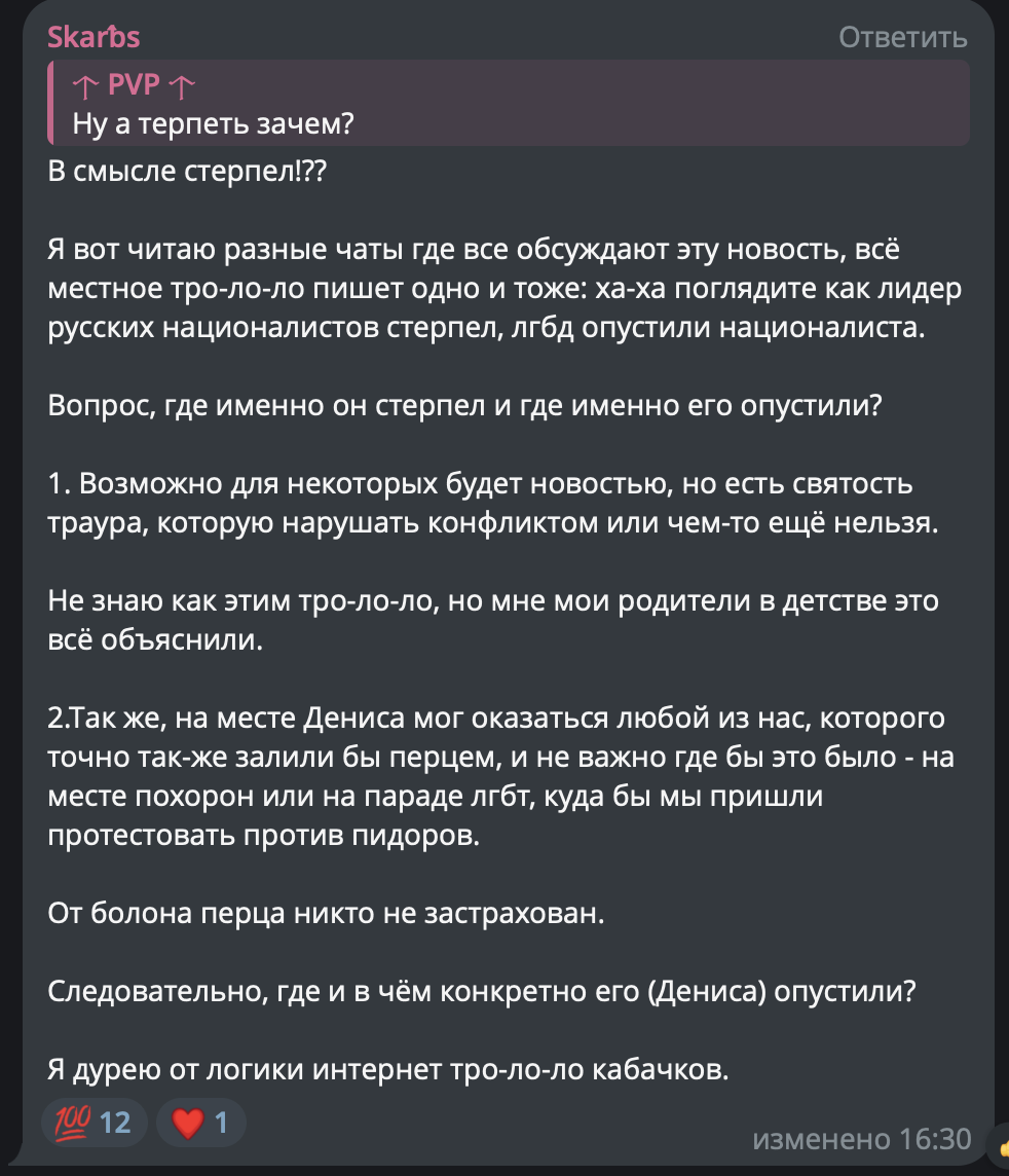>>1061369 Еще не забудь что в большом хайлайте на Ютубе который называется как то вроде"эволюция взглядов маргинала" (один из первых по запросу (убер)маргинал украина) он буквально говорит что начал смотреть усраинзге высеры ТОЛЬКО назло тем кому сходка не понравилась лол. То есть он думает что тому же погрому было не похуй что чмо переобулось. Это буквально поведение посаженного в тюрьму солдата ИРА в Британии который думает что его голодовка кого то заденет. Спойлер нет. Про чмо, как и про объявивших голодовку солдат ИРА просто забудут окончательно. У чма остался один выбор, либо снять голодовку, остаться инвалидом но сидеть с онлайном 120 дальше либо окончательно умереть.