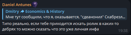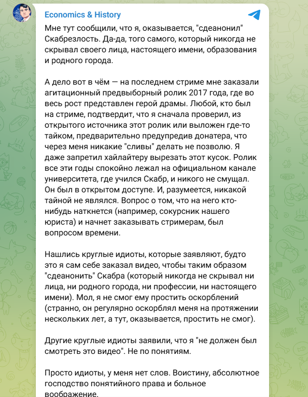 >идиоты, которые заявляют, будто это я сам себе заказал видео, чтобы таким образом "сдеанонить" Скабра (который никогда не скрывал ни лица, ни родного города, ни профессии, ни настоящего имени) Так, падажжи, один вопрос заказал ли ты видео сам себе чтобы подставить Федю, и другой вопрос где лежало это видео. Карел может сам о себе направо и налево пиздеть, и видео может быть в открытом доступе — другой вопрос, что какой-нибудь хитрый литвин может захотеть привлечь внимание к этой открытой инфе, и сам заказать себе это видео.