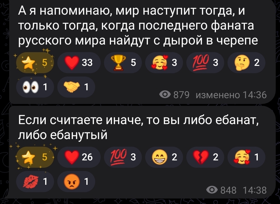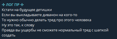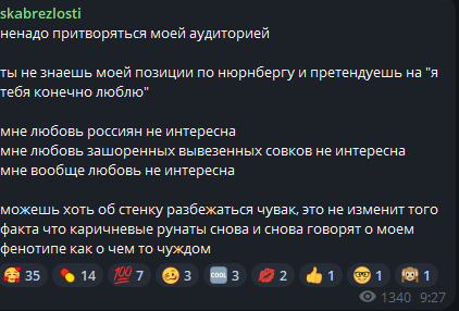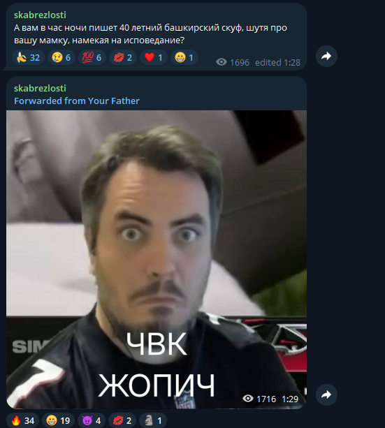 >Другие круглые идиоты заявили, что я "не должен был смотреть это видео". Не по понятиям. Ну сармат посмотрел, например, но не стал открыто подсвечивать, что это скабр, повёл себя по людски. А кто-то повёл себя странным образом.